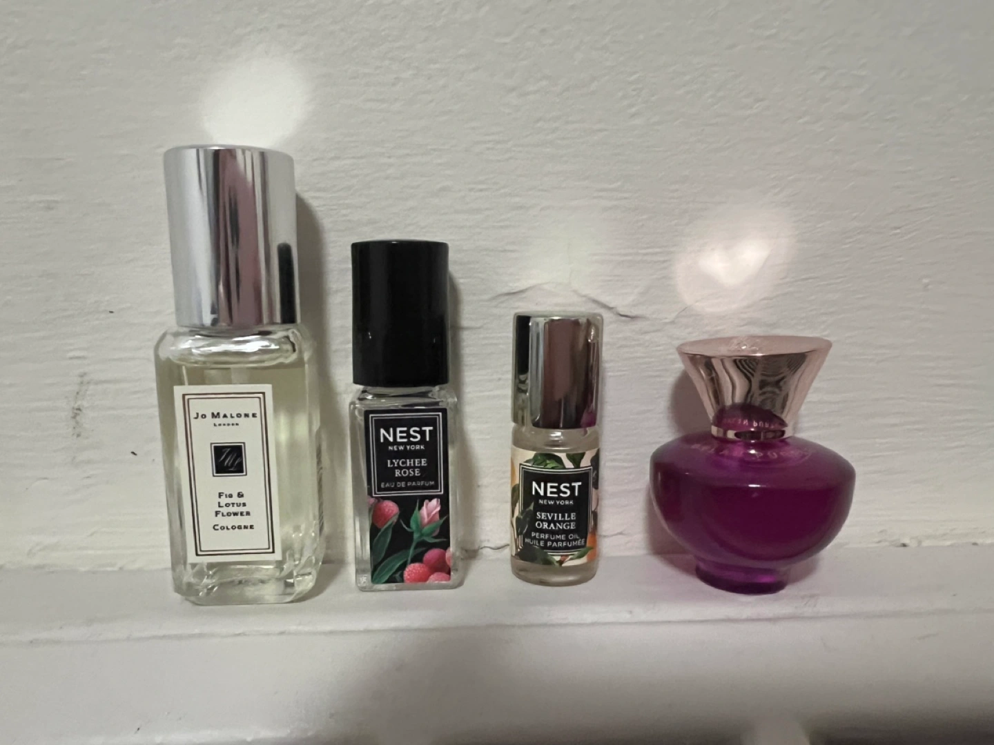 Jo Malone Fig & Lotus Flower Cologne, Nest Lychee Rose Eau de Parfum, and Nest Seville Orange Perfume Oil and Versace Dylan Purple.