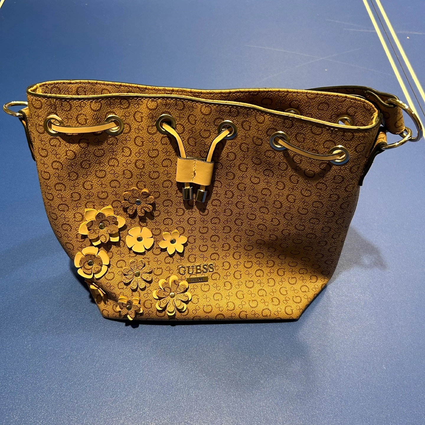 Adorable Guess bucket bag (also can be called a purse or handbag). Features a brown monogram print, flower embellishments, and a drawstring closure. Includes a crossbody strap. Interior features multiple pockets. Perfect for everyday use.