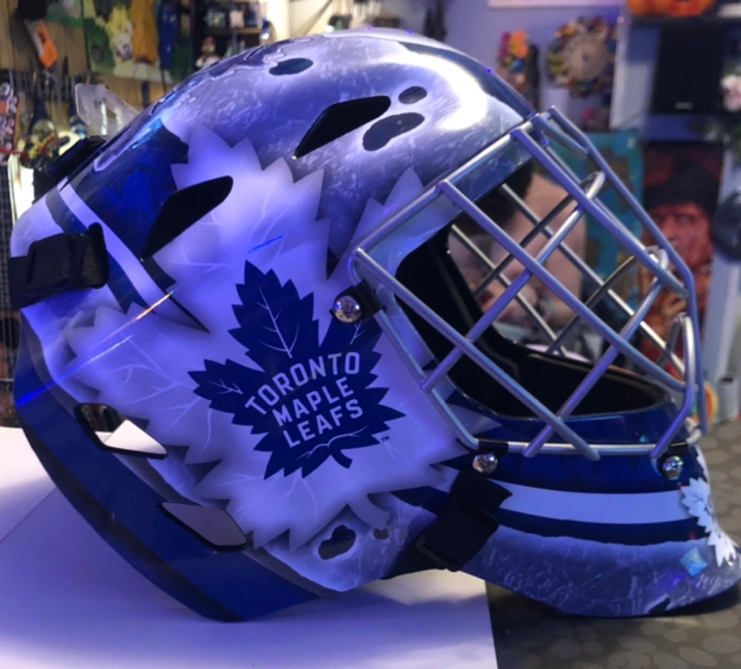 Toronto Maple Leafs Goalie mask. Features Toronto Maple Leafs design. Melting ice design. Franklin brand. Model GFM 1500. NHL licensed. Youth Size mask. Intended for street/roller hockey. Perfect for kids, fans or collectors! Willing to meet up, drop off, or porch pick up.