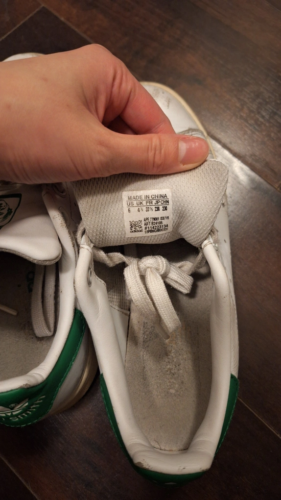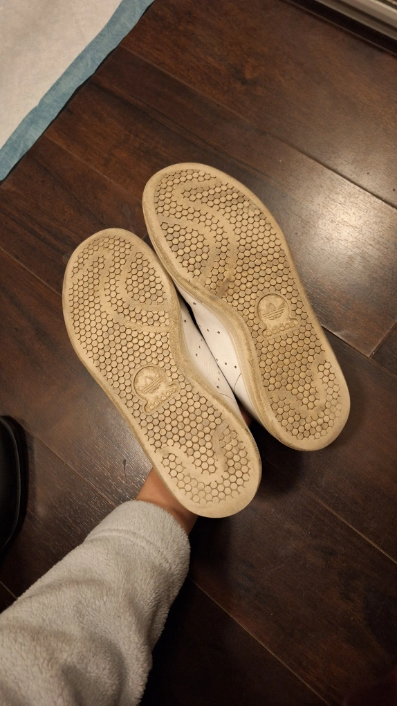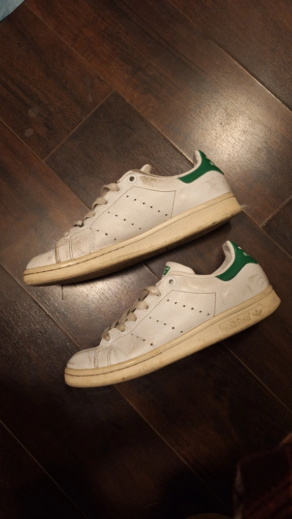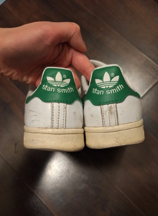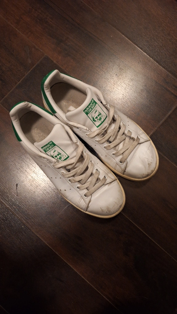 Adidas Stan Smith sneakers. White leather upper, green accents. Show some wear