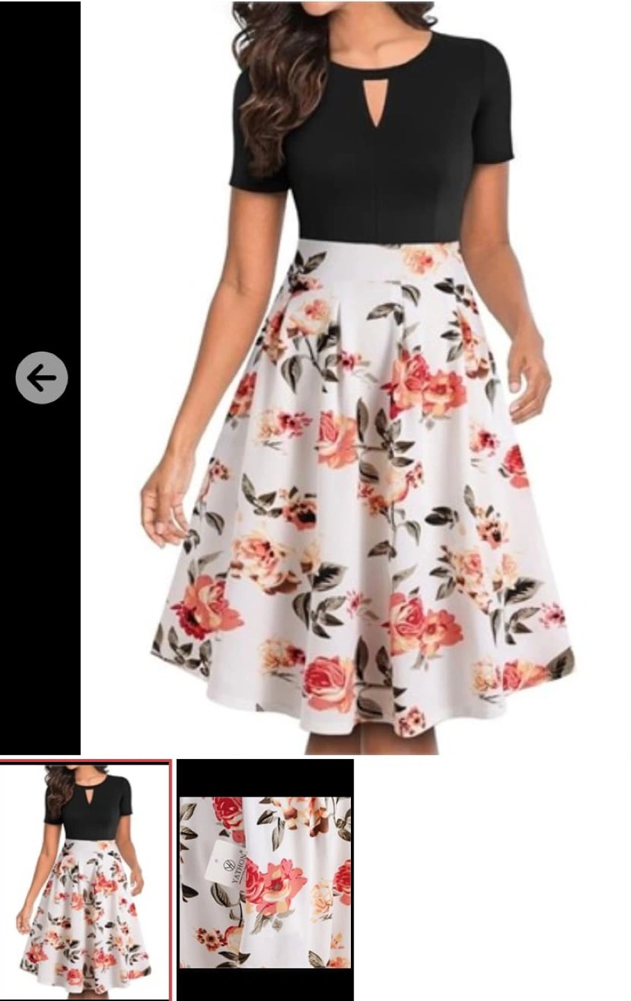 Women's knee-length dress. Features a black bodice and floral-print skirt. Short sleeves and keyhole neckline. A-line silhouette.