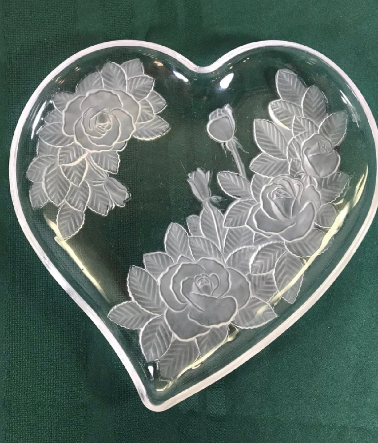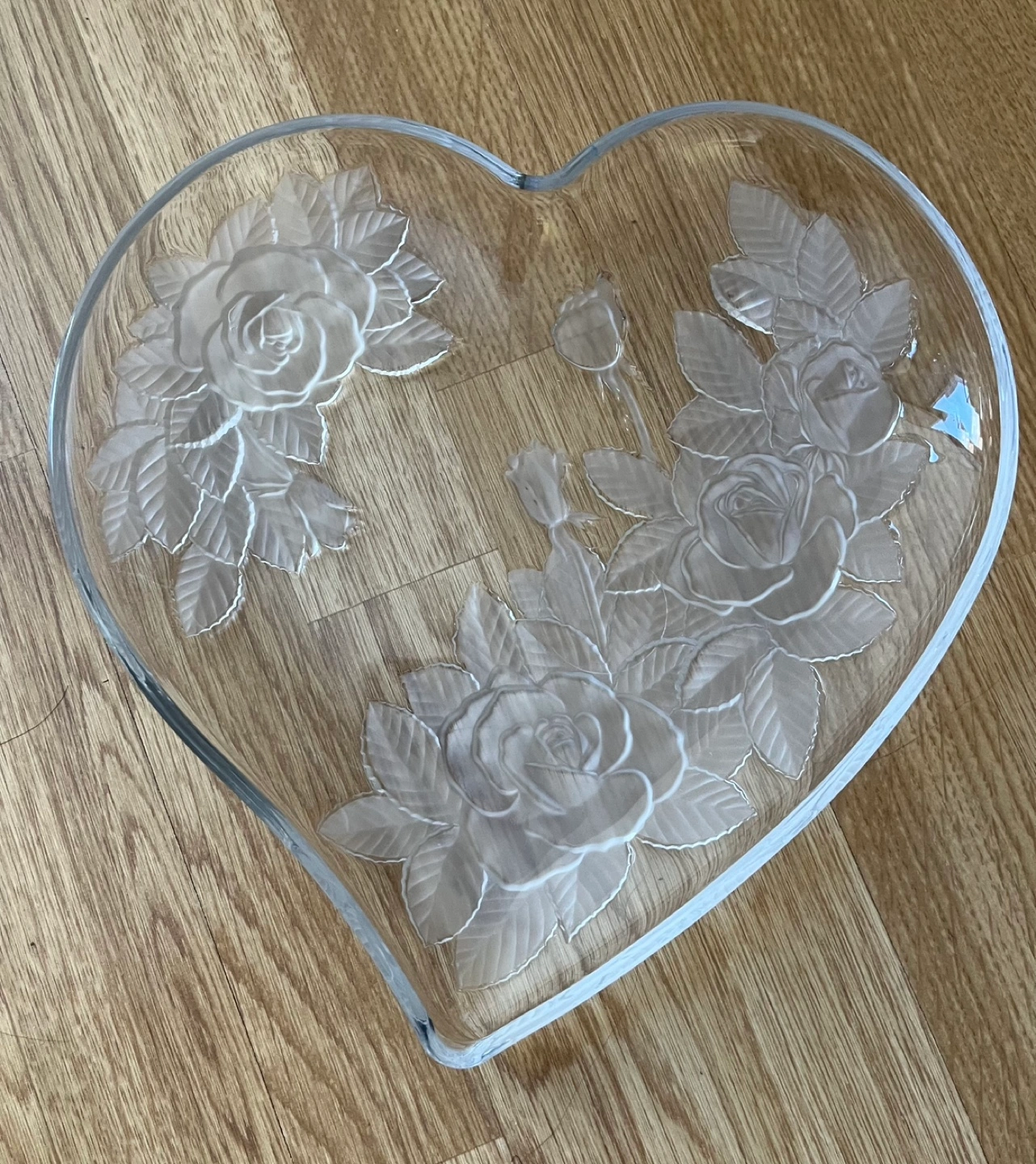 Mikasa Studio Nova Heart Shaped “Winter Rose” Crystal Hostess platter plate embossed frosted roses serving tray Asymmetrical shape