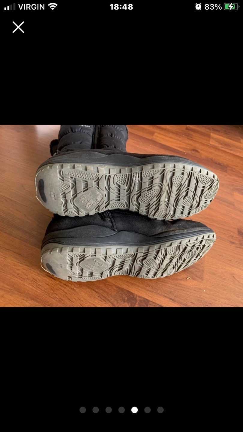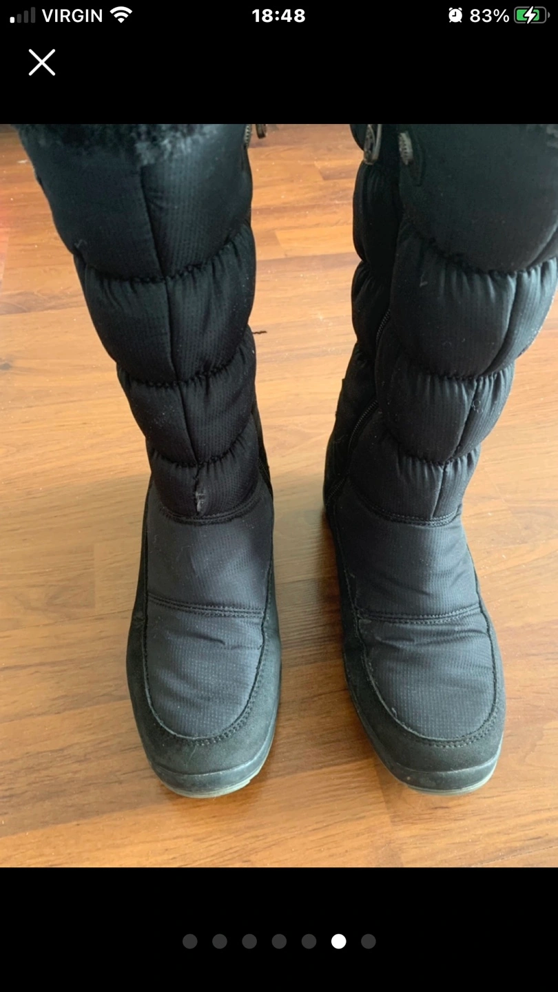 Black quilted winter boots. Zipper closure. Slight damage on one boot. Good condition otherwise. Warm and comfortable.