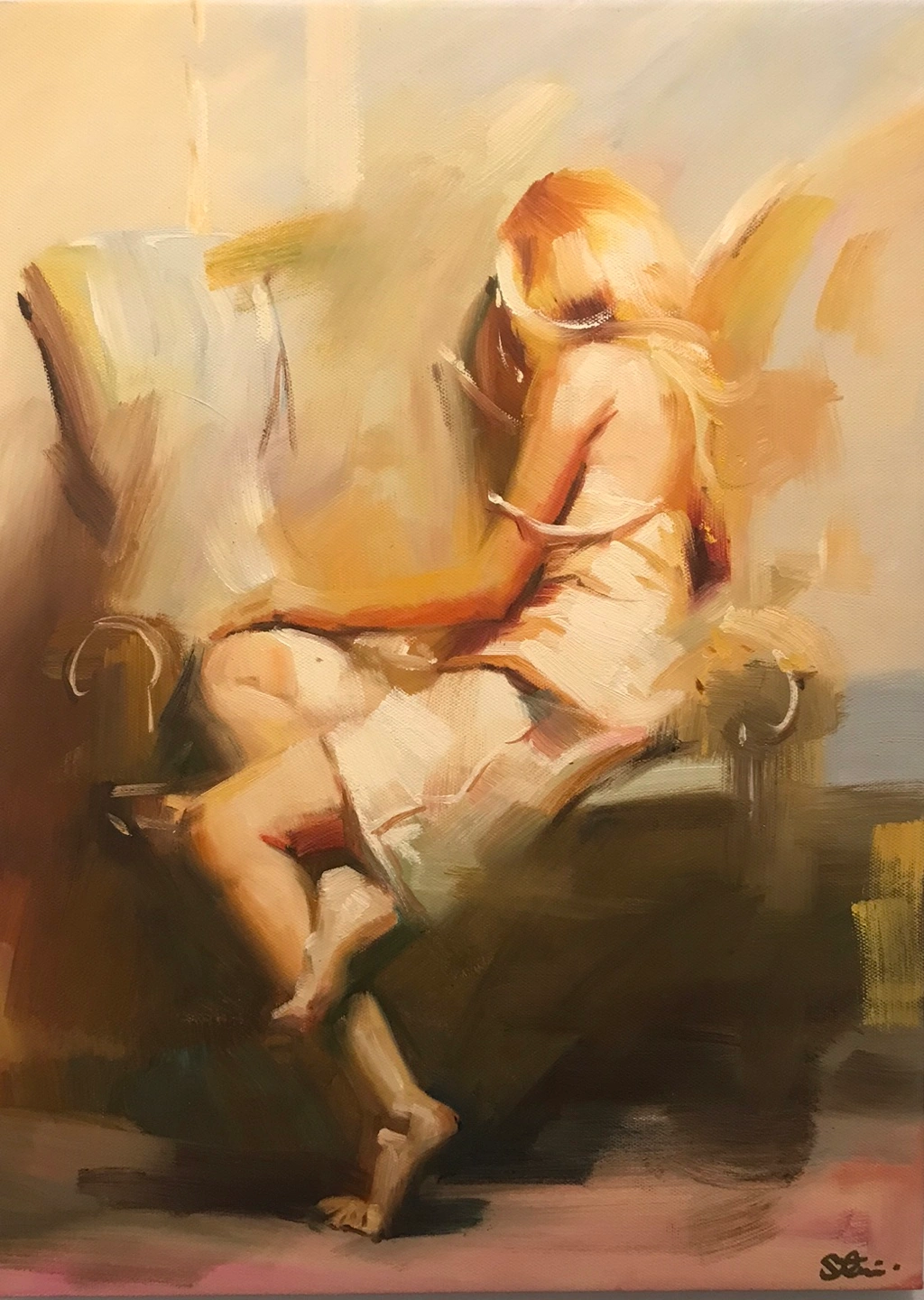 Beautiful original oil painting on canvas. Depicts a woman sitting on a chair. Loose brushstrokes. Artist signature in bottom right corner.