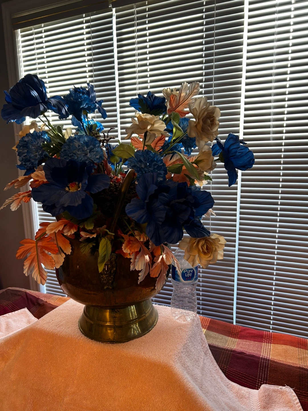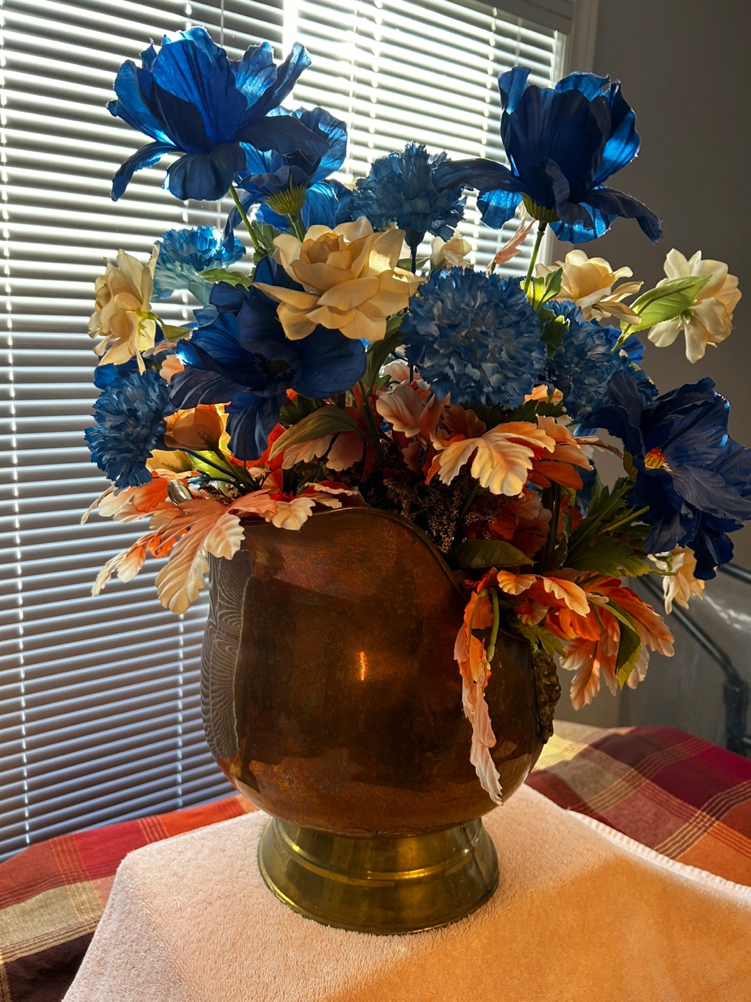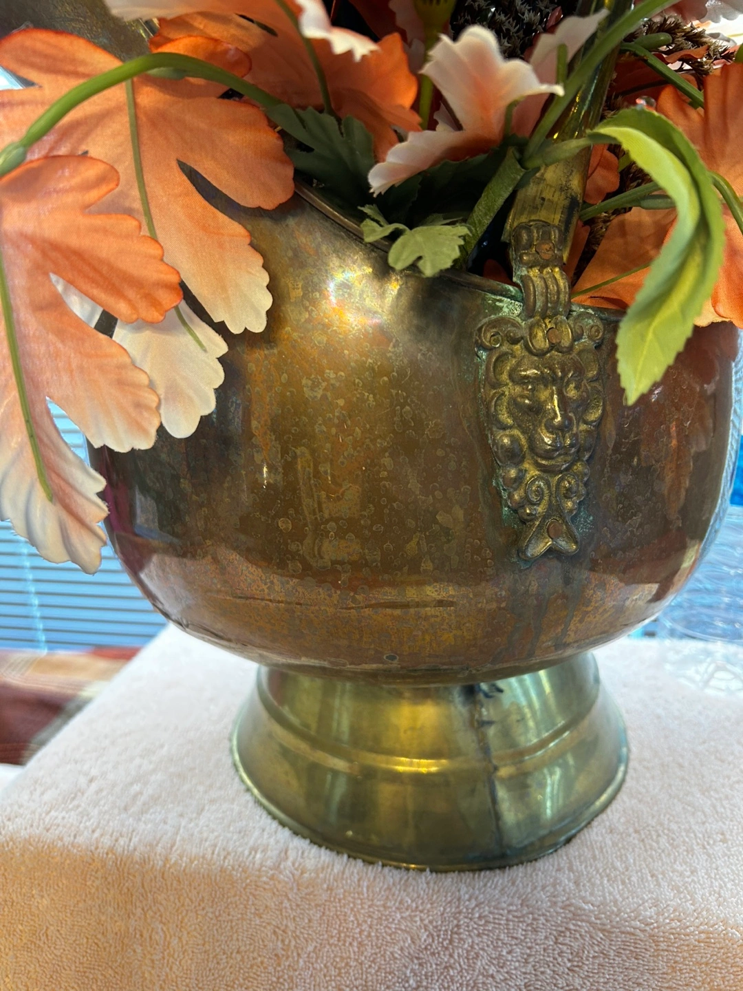 Large vintage planter or vase. Copper body with brass base and lion head handle detail. Shows signs of age and wear. Perfect for displaying flowers or other decor.