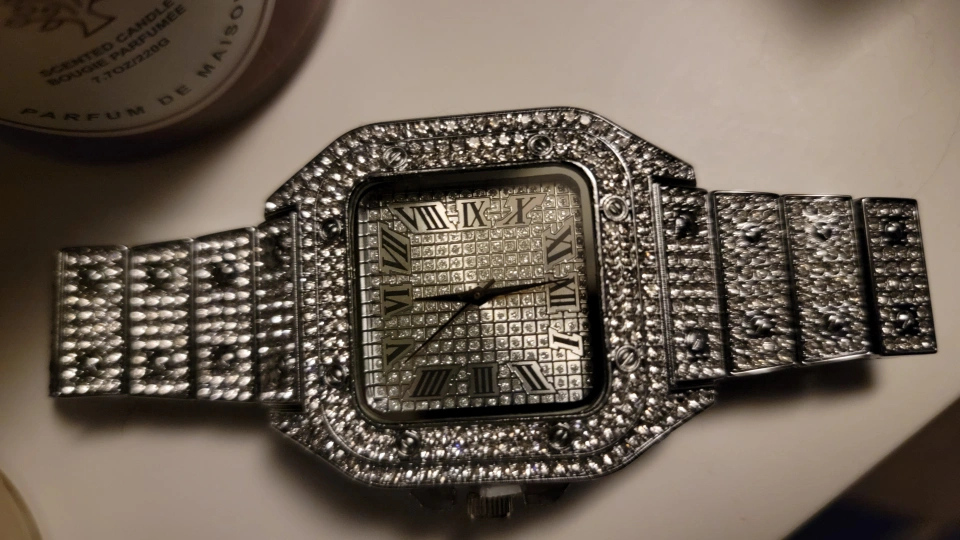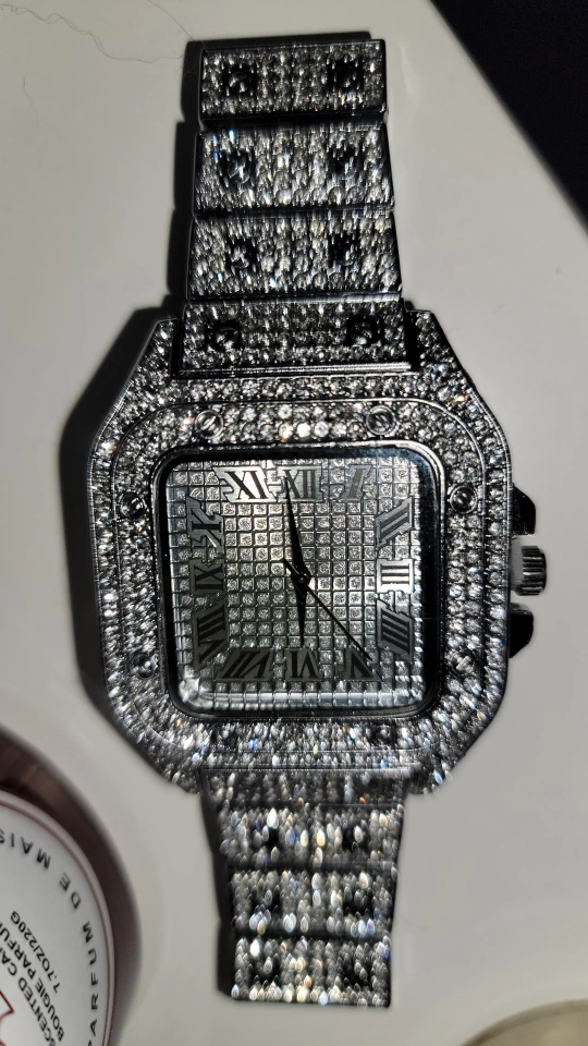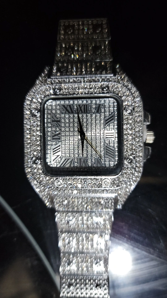 Men's silver tone iced out watch. Square face, fully iced out with clear stones. Quartz movement. Working condition.