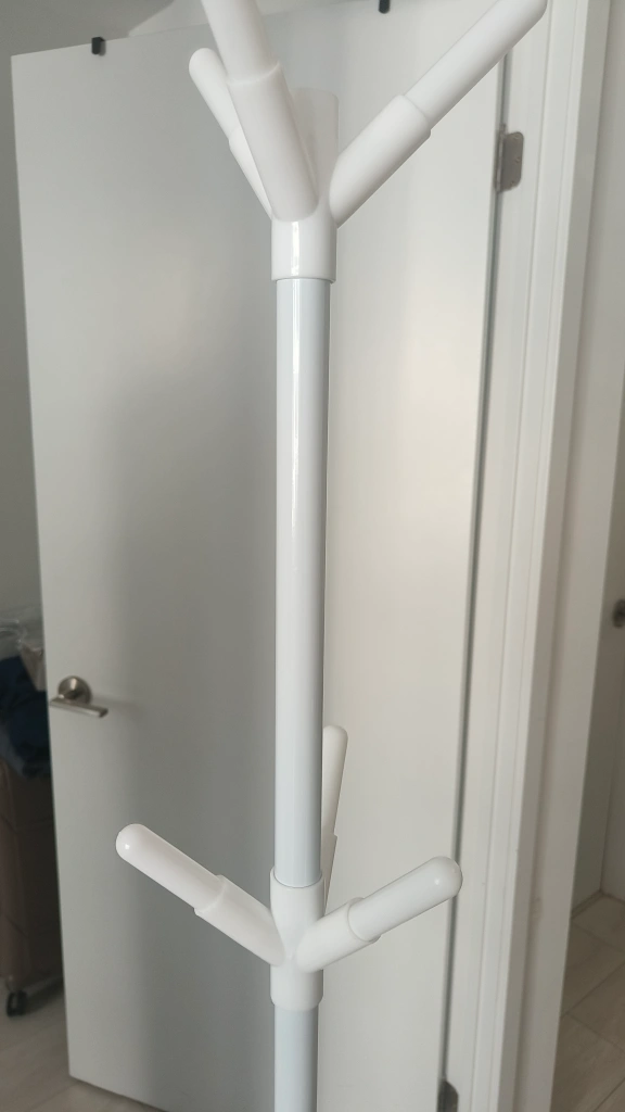 Simple, modern design. Multiple hooks for coats, bags, etc. Sturdy, lightweight construction. Easy assembly and storage.
