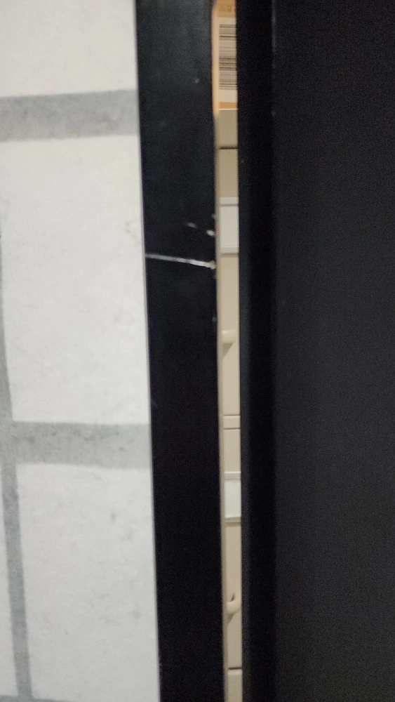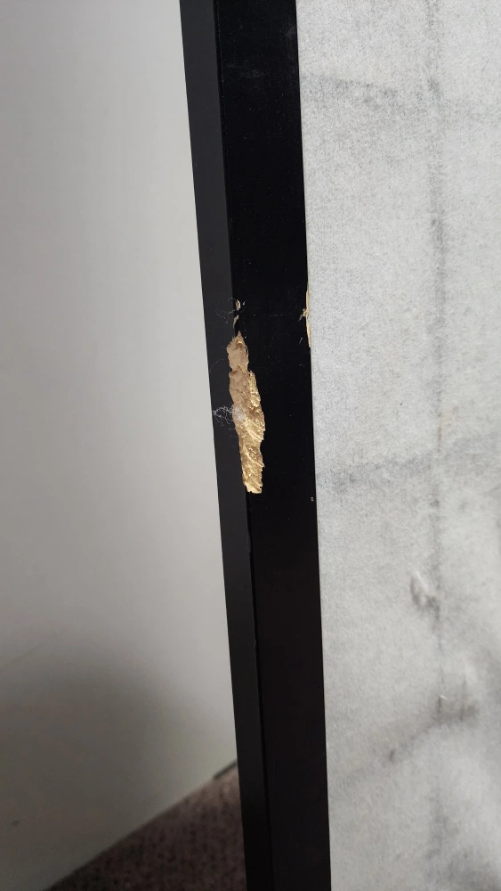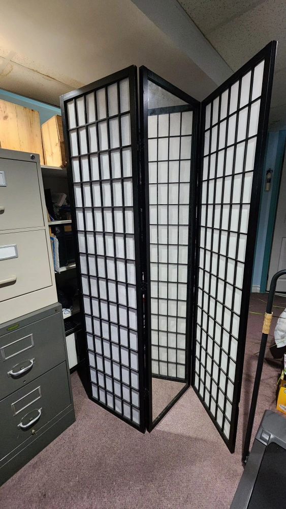 Room divider, three panels, with mirror black frame, off-white paper inserts. Approximately 72" tall and 17" wide per panel. Some minor wear.