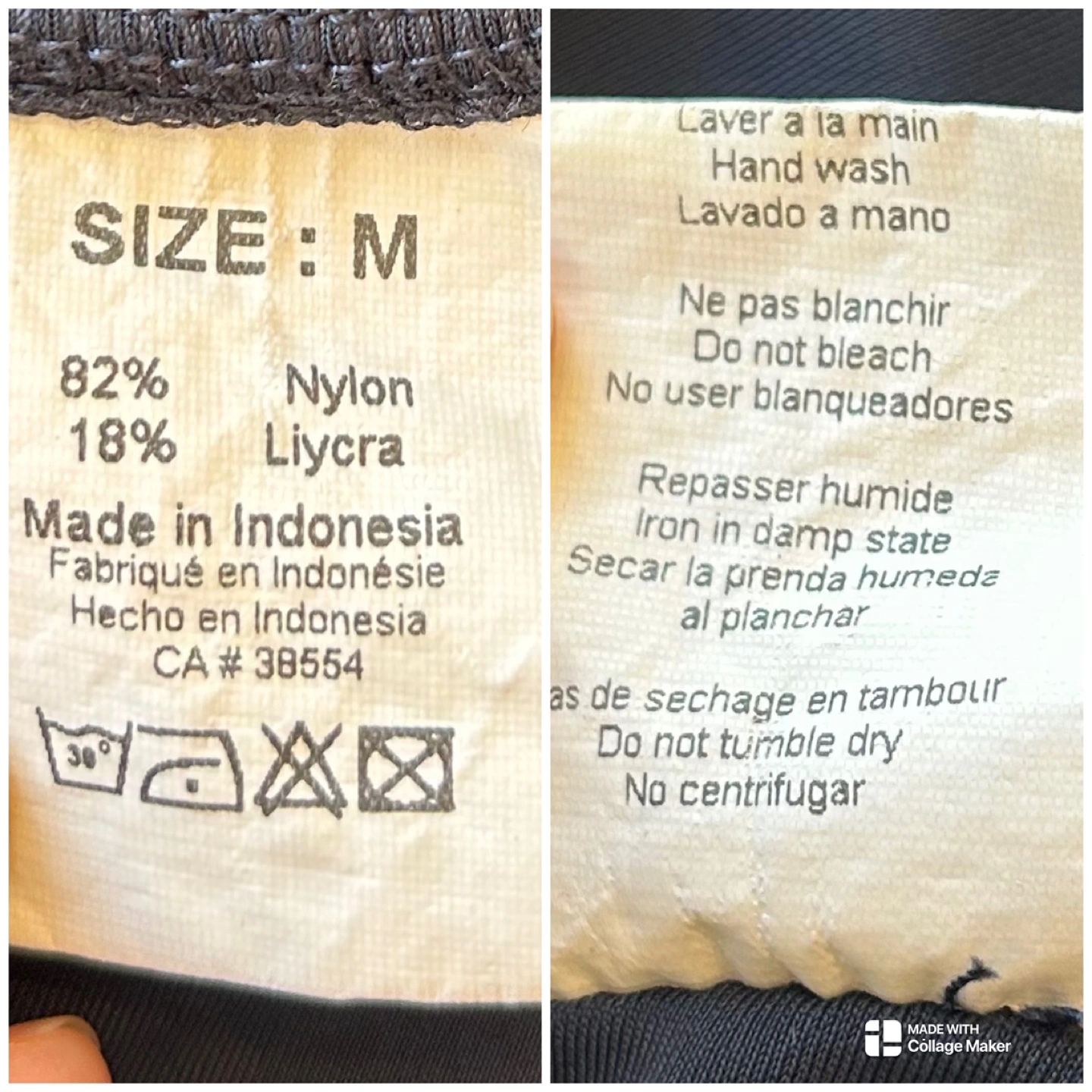 Material: Nylon/Lycra blend feels almost like a lightweight swimsuit type fabric
