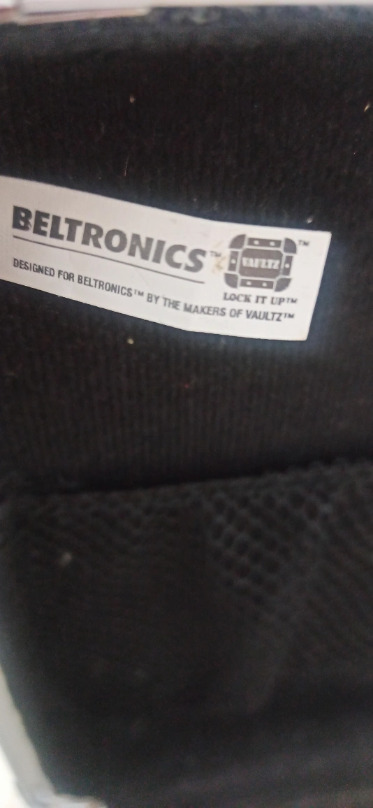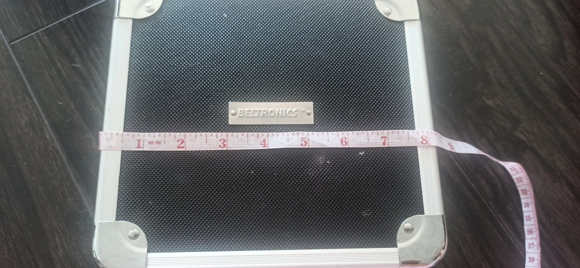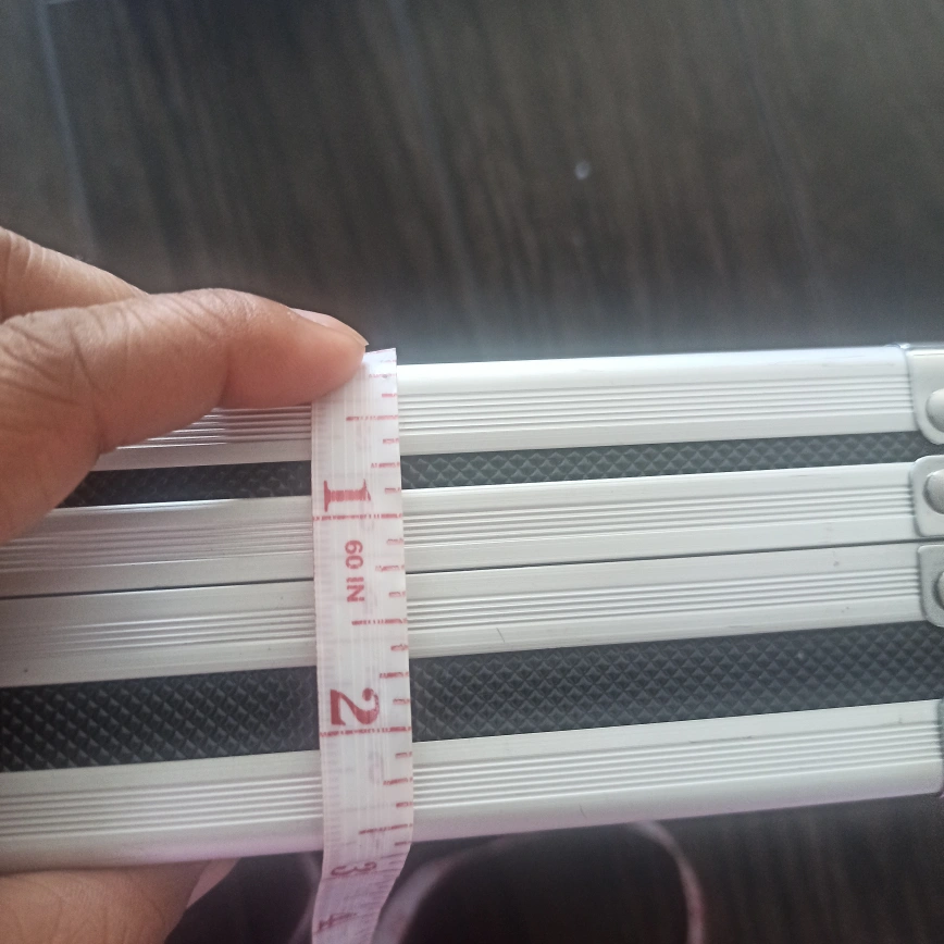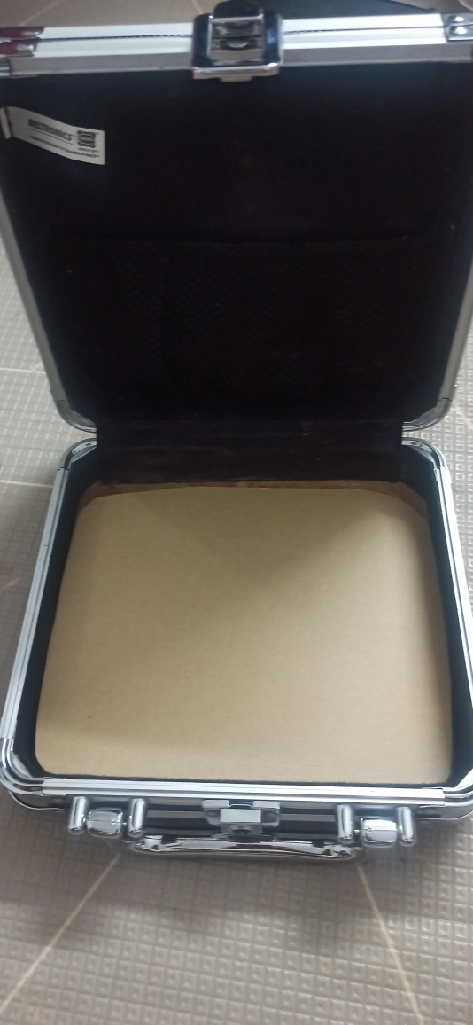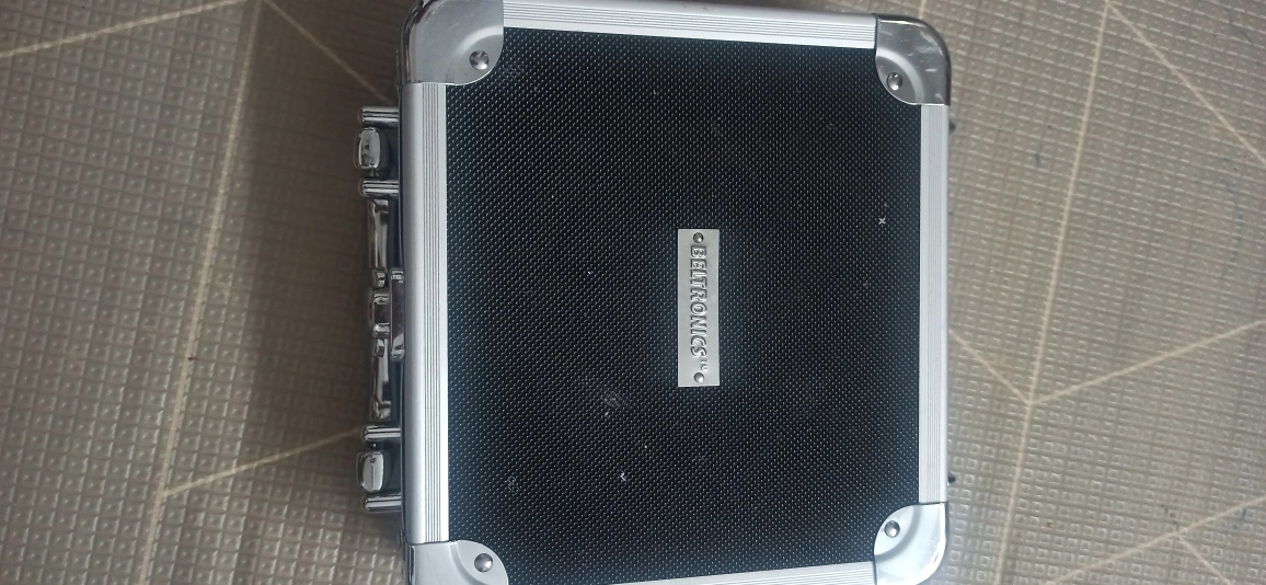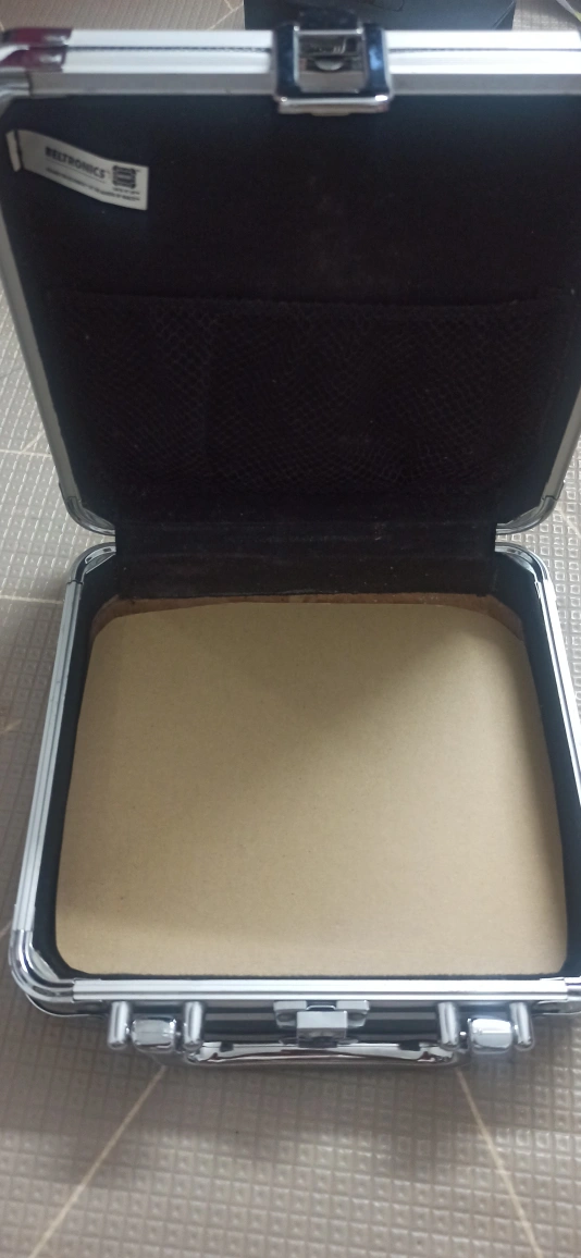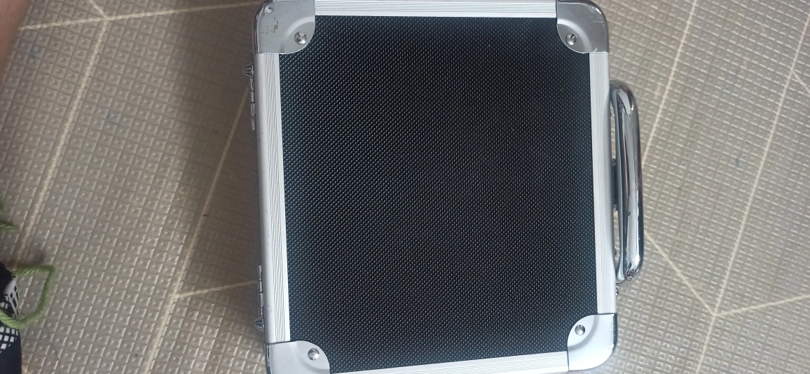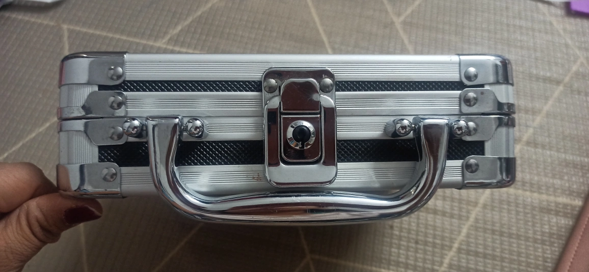 Small aluminum carrying case. Features a metal clasp and handle. Black interior lining. Empty case, perfect for storing small items.