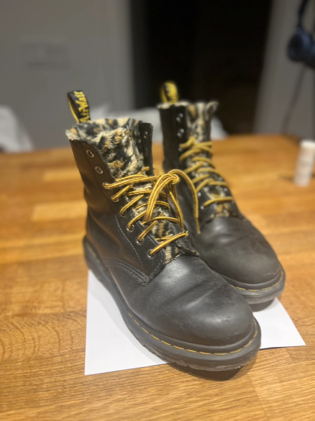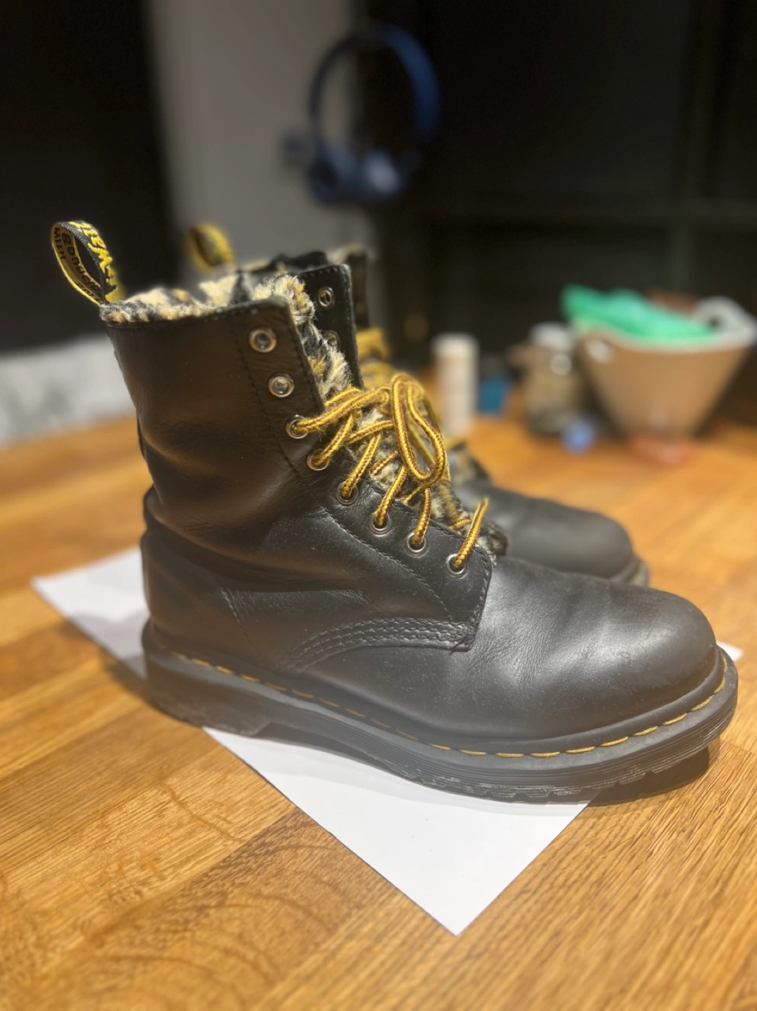 Women's Dr. Martens 1460 Pascal boots. Black leather upper. Leopard print faux fur lining. Yellow laces. Pre-owned, good condition.