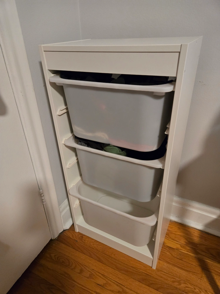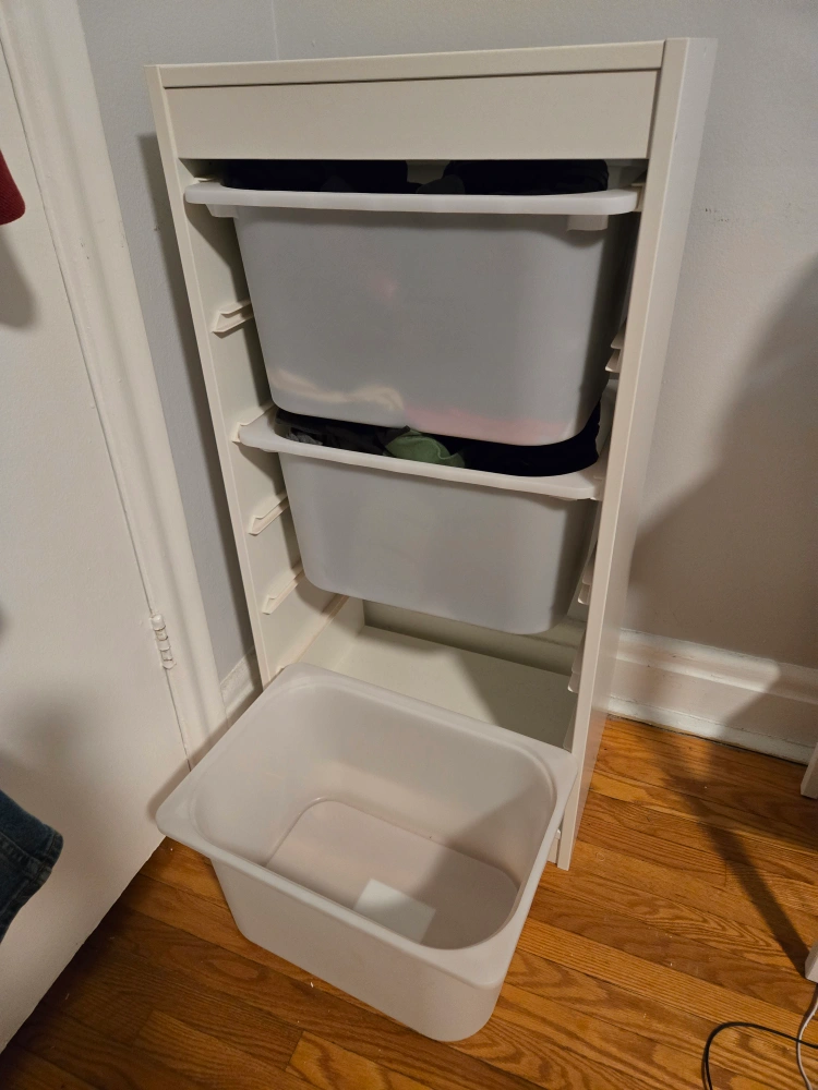 White storage unit. Three deep bins. Perfect for organizing clothes, toys or other items. Some minor wear.