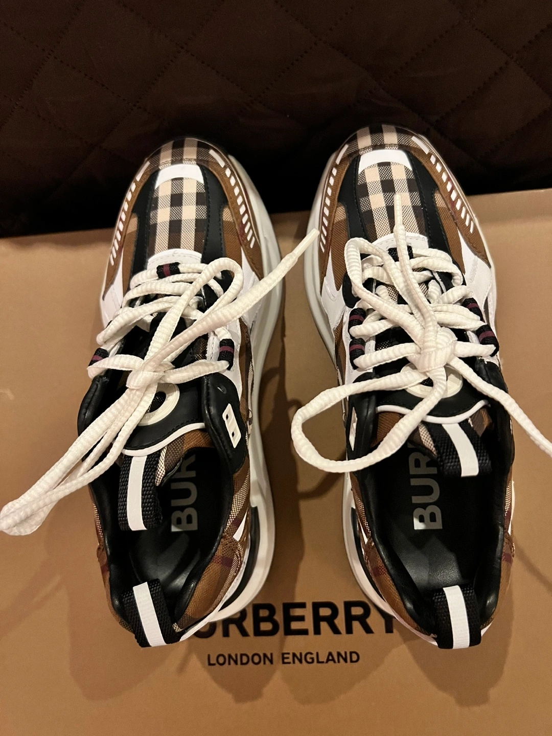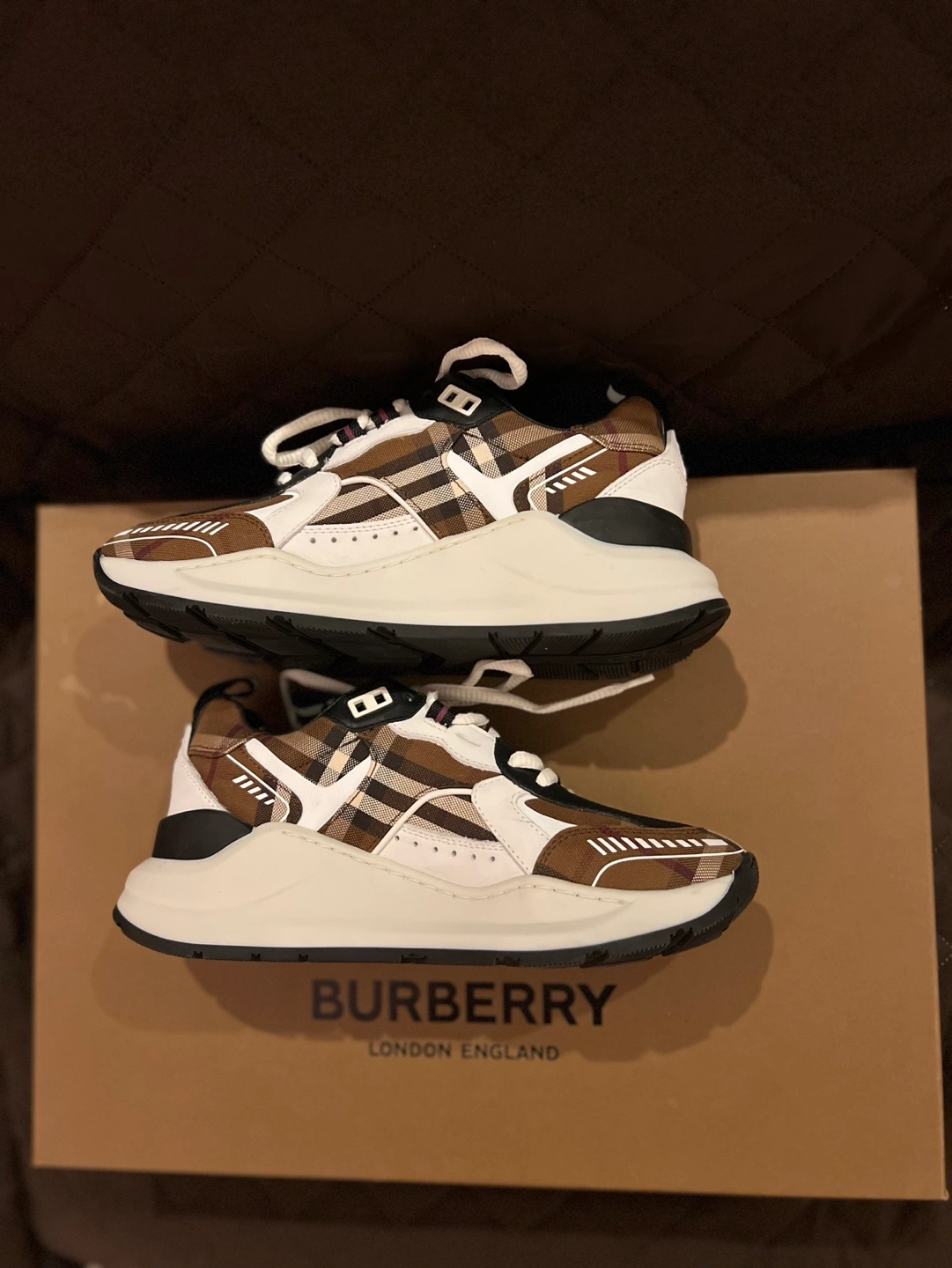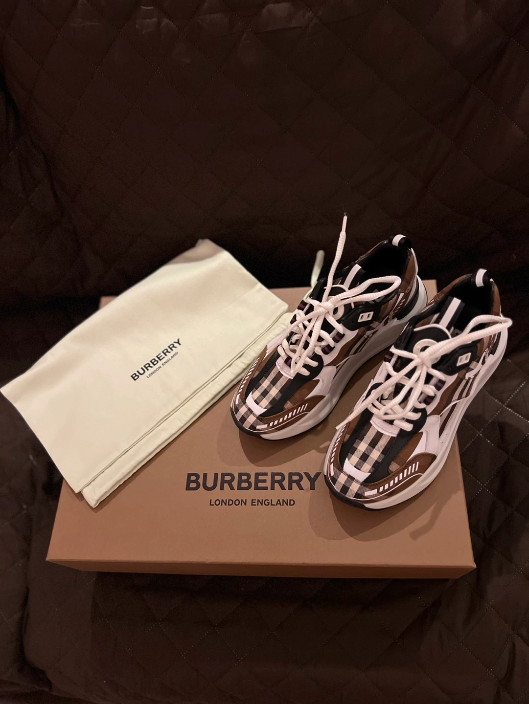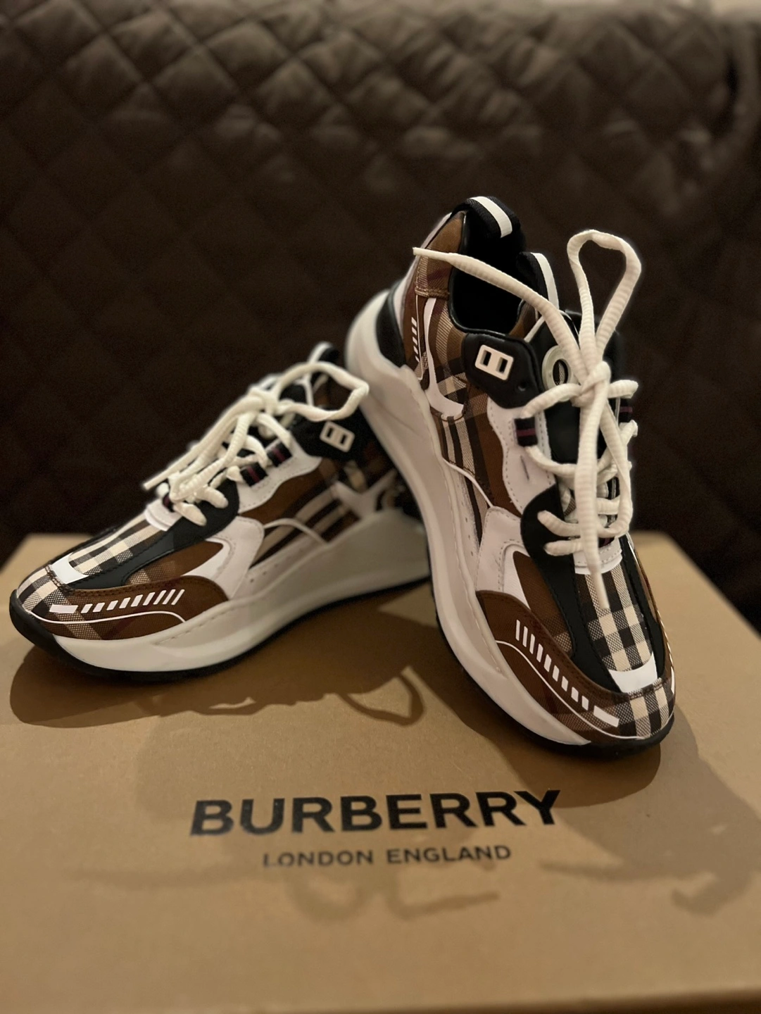 45Brown and white check print sneakers. Features a chunky sole and white laces. Comes with original box and dust bag. Originally $970 plus taxes.