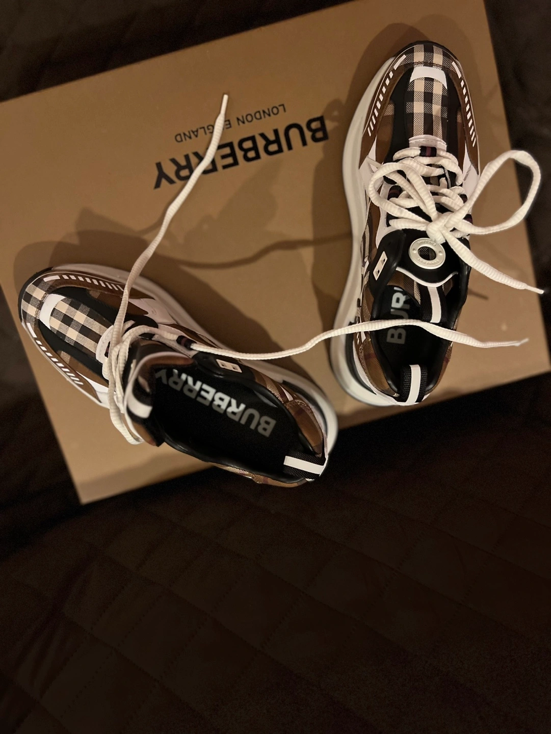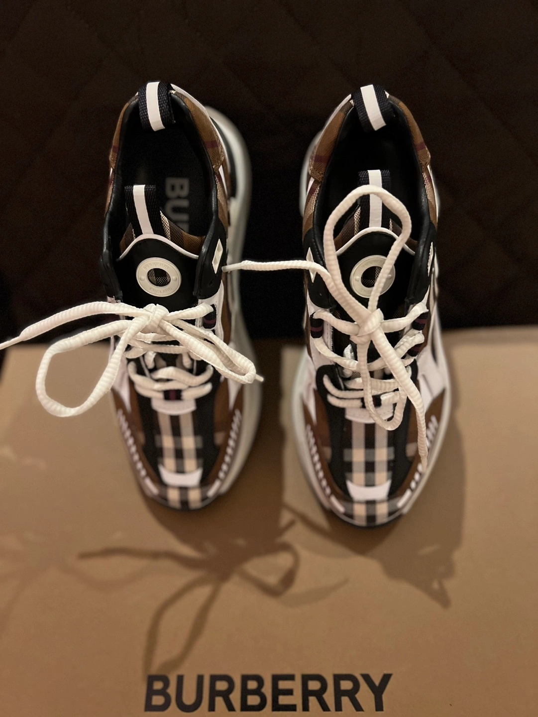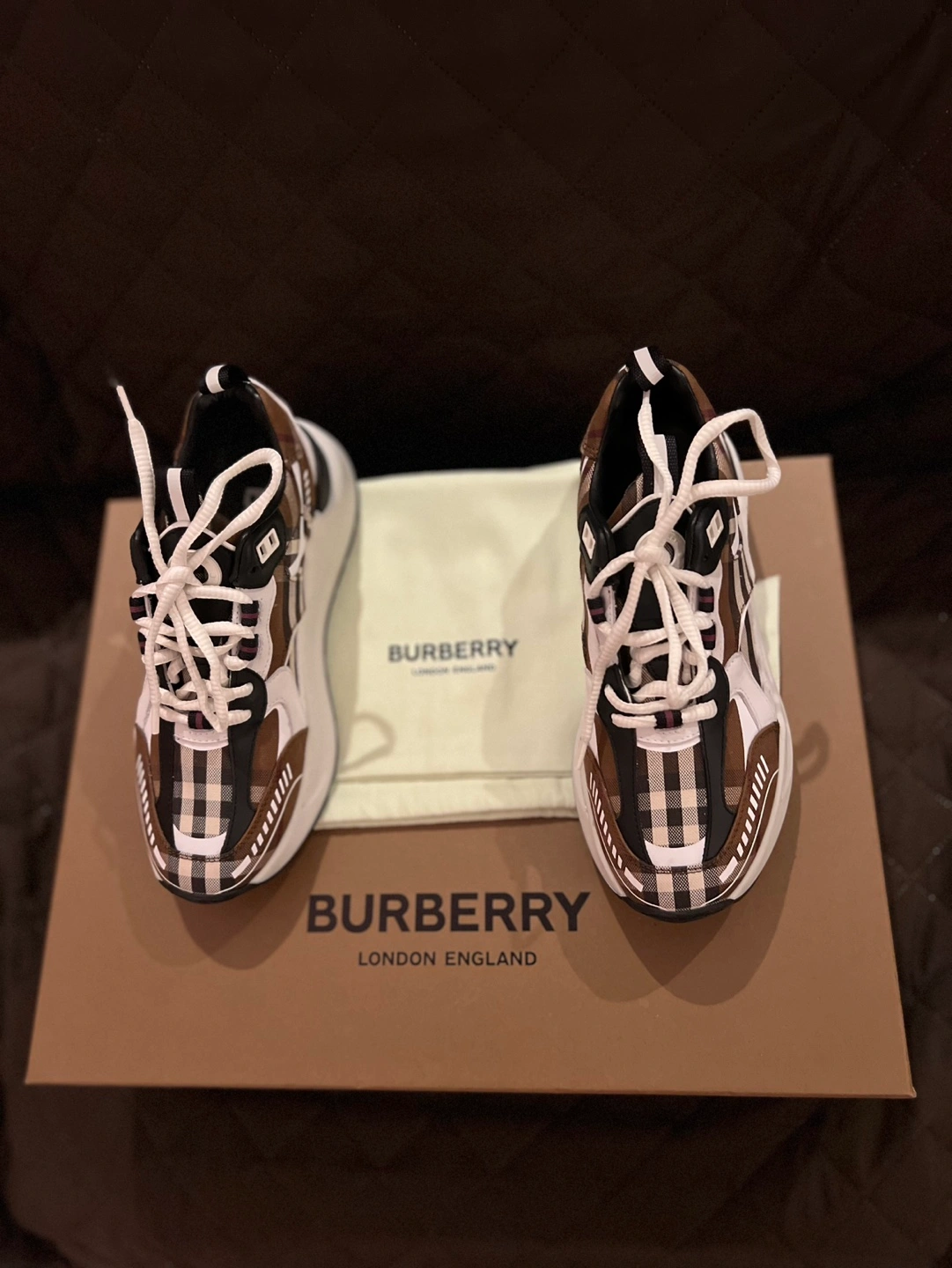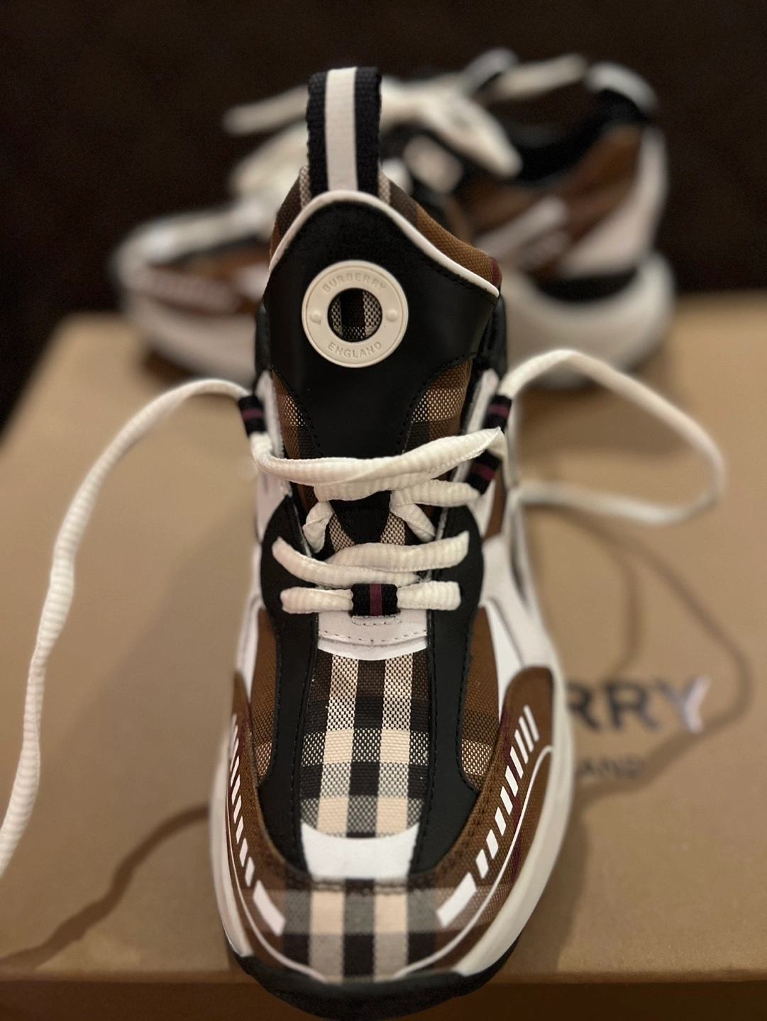 45Brown and white check print sneakers. Features a chunky sole and white laces. Comes with original box and dust bag. Originally $970 plus taxes.