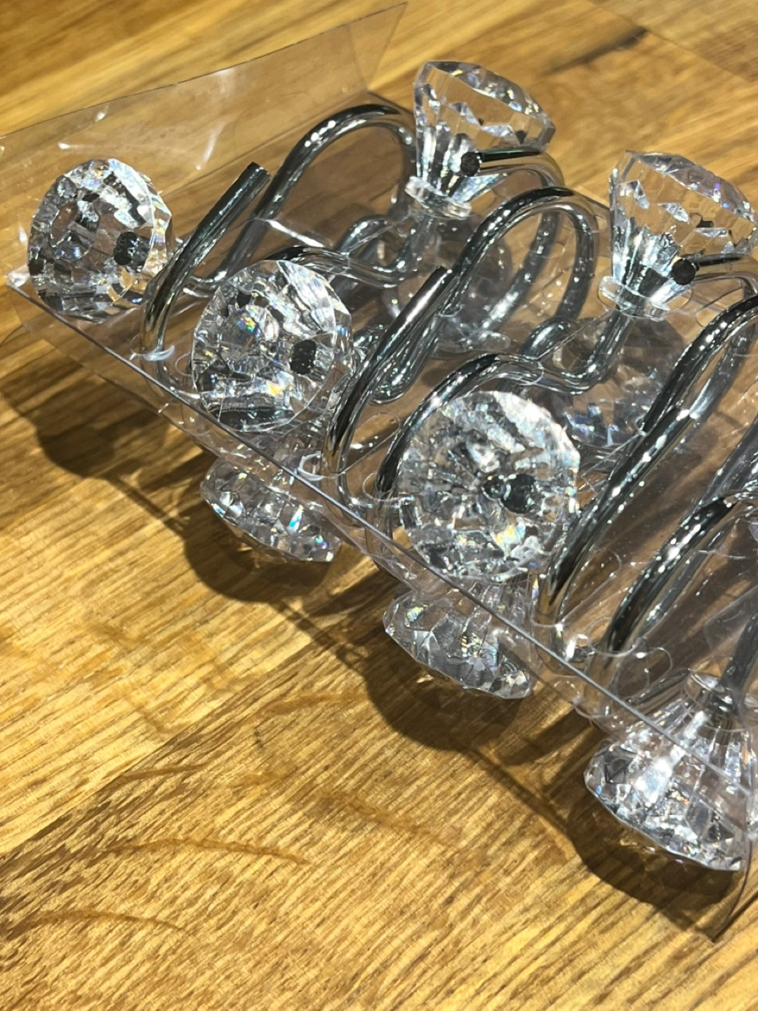 212Set of twelve shower curtain hooks. Chrome metal with clear crystal finials. New, in original packaging.