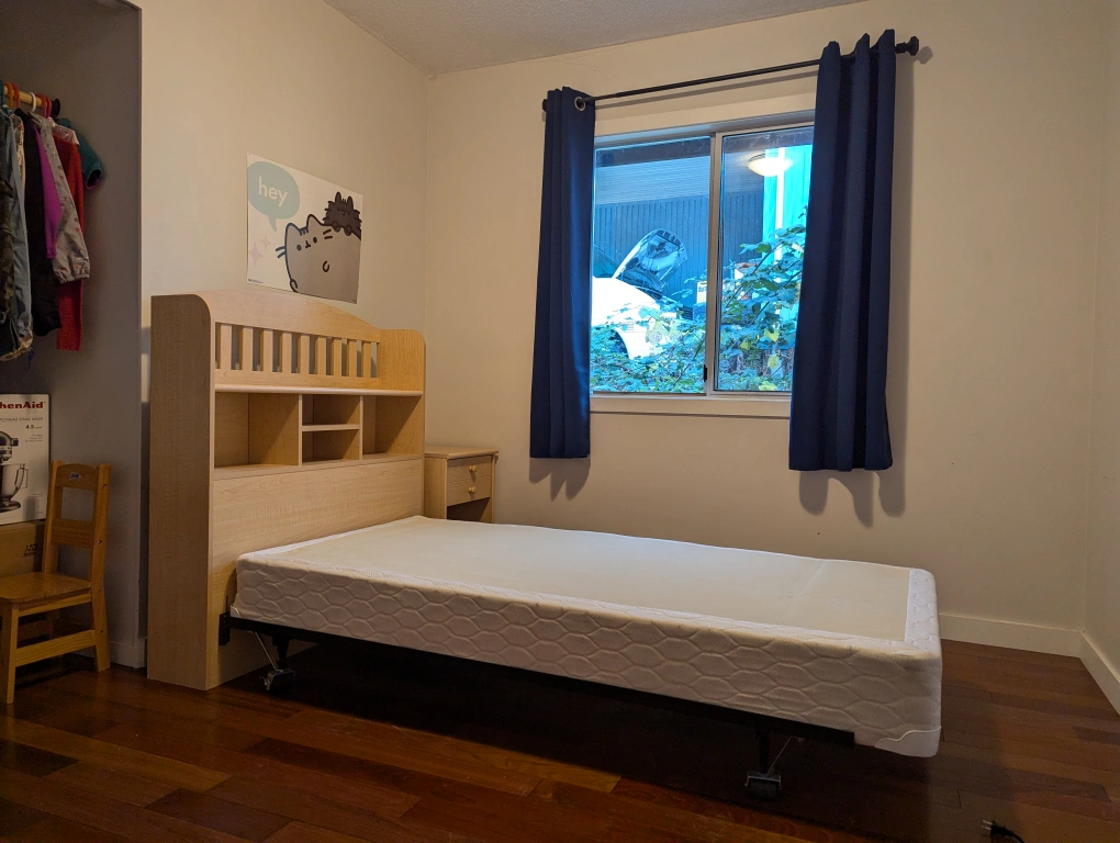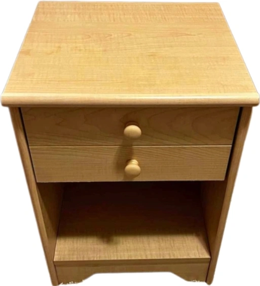 Light wood children's bedroom set. Includes six-drawer dresser, two-drawer nightstand, and headboard with shelving. Excellent condition. Perfect for a child's room.