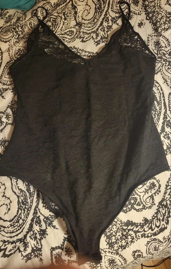 Ladies black lace bodysuit with spaghetti straps/snap closure new never worn with tags.