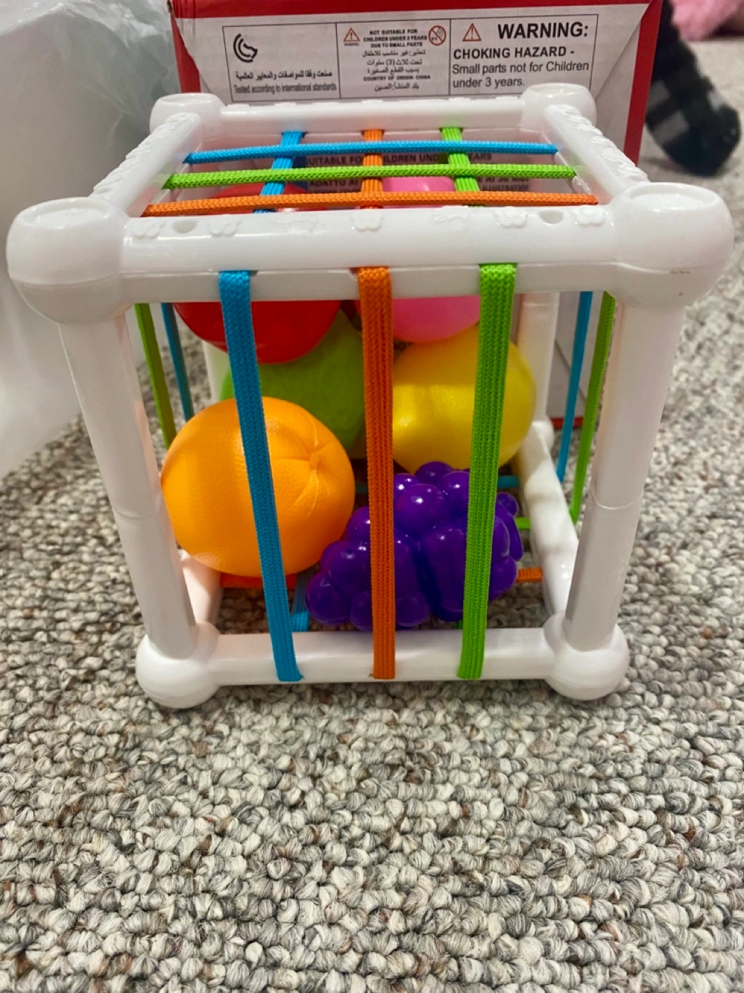 Adorable baby bundle includes a colourful sensory cube with lacing toy, a wooden xylophone, a musical spinning toy with lights and sounds, and a pair of Carter's baby shoes with a heart pattern. Perfect for early development and playtime.