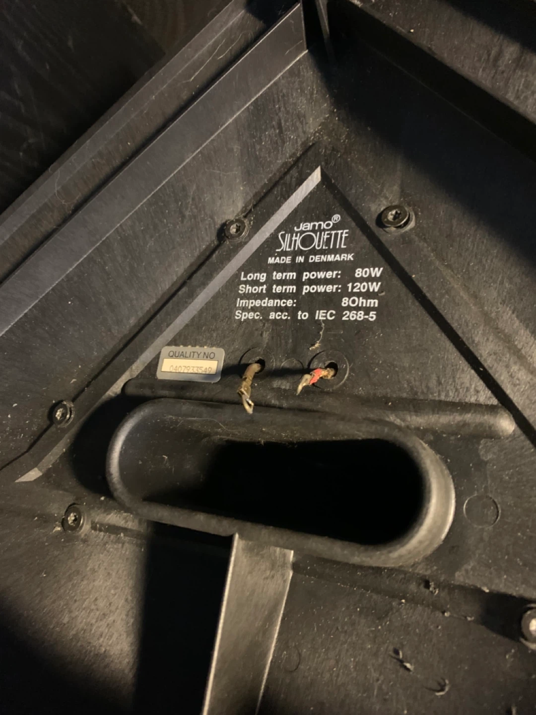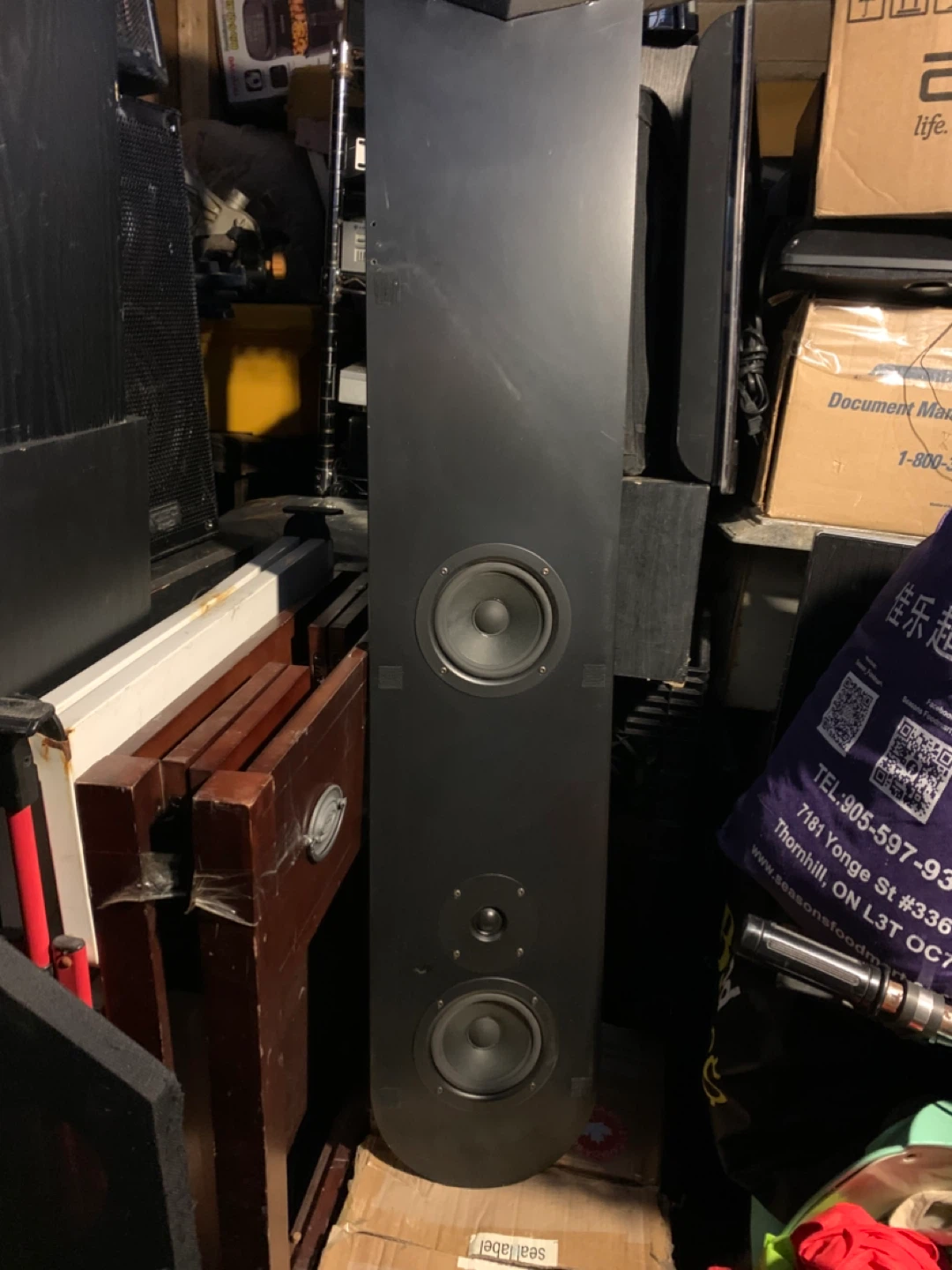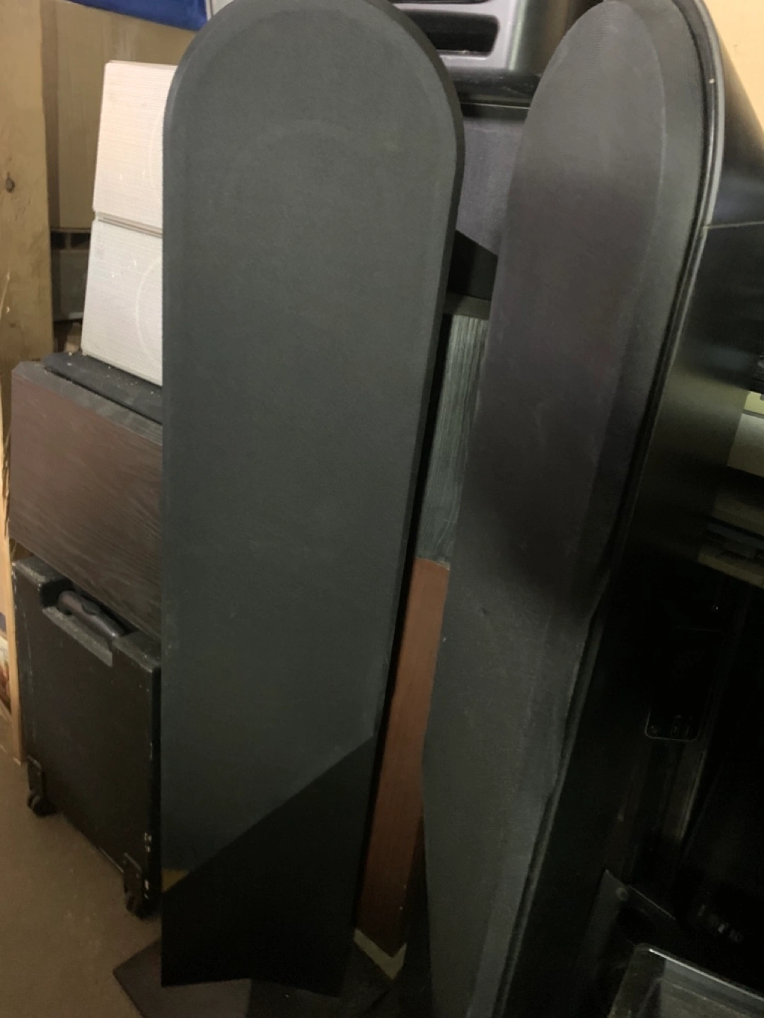Pair of tall floor standing 3ways speakers from Denmark. Black cloth grilles. Excellent for home theatre or stereo system. Used, but in good condition.