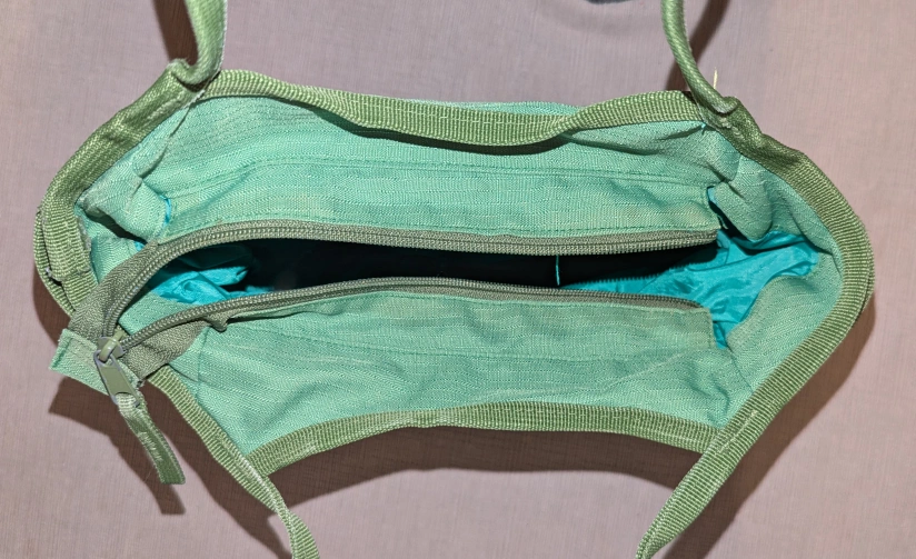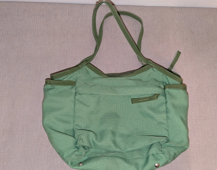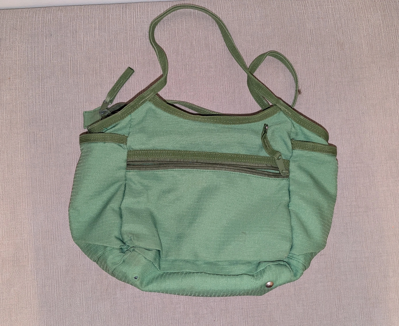 Olive green shoulder bag. Features multiple zippered pockets and a spacious main compartment. Durable fabric construction. Two top handles for carrying.