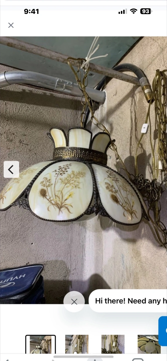 83Beautiful vintage hanging lamp. Features a floral design on a cream-coloured glass shade. Brass-toned metal accents. Chain included.