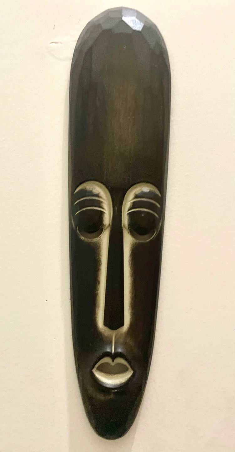 Dark brown wooden mask. Features a carved face with simple details. Unique design. Perfect for adding character to any space.