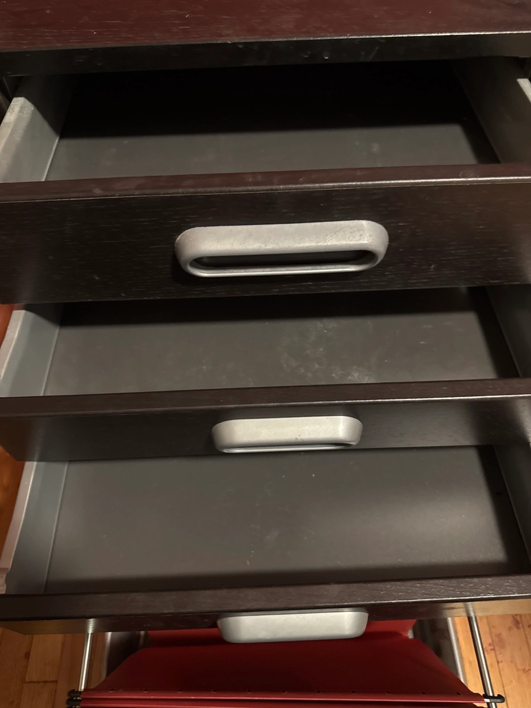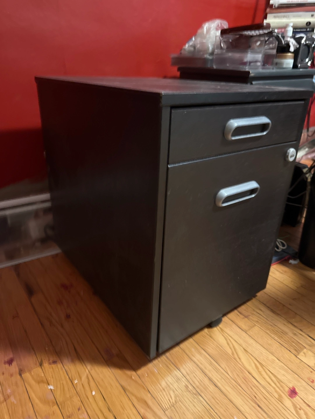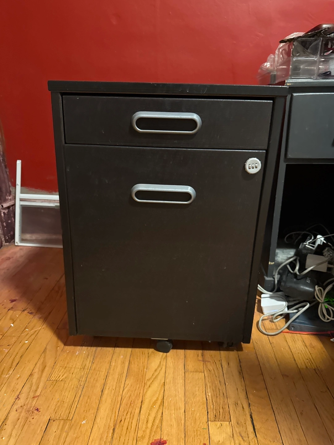 175Dark brown mobile file cabinet. Three drawers, two regular and one with a hanging file system. Metal drawer pulls. Small and compact.