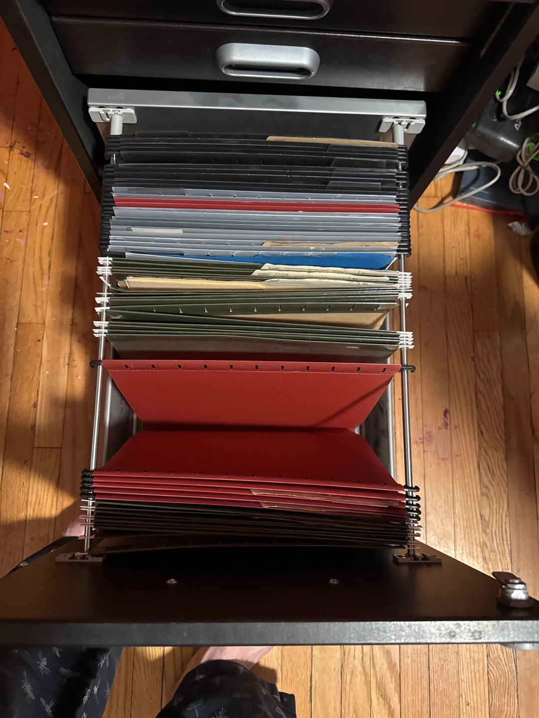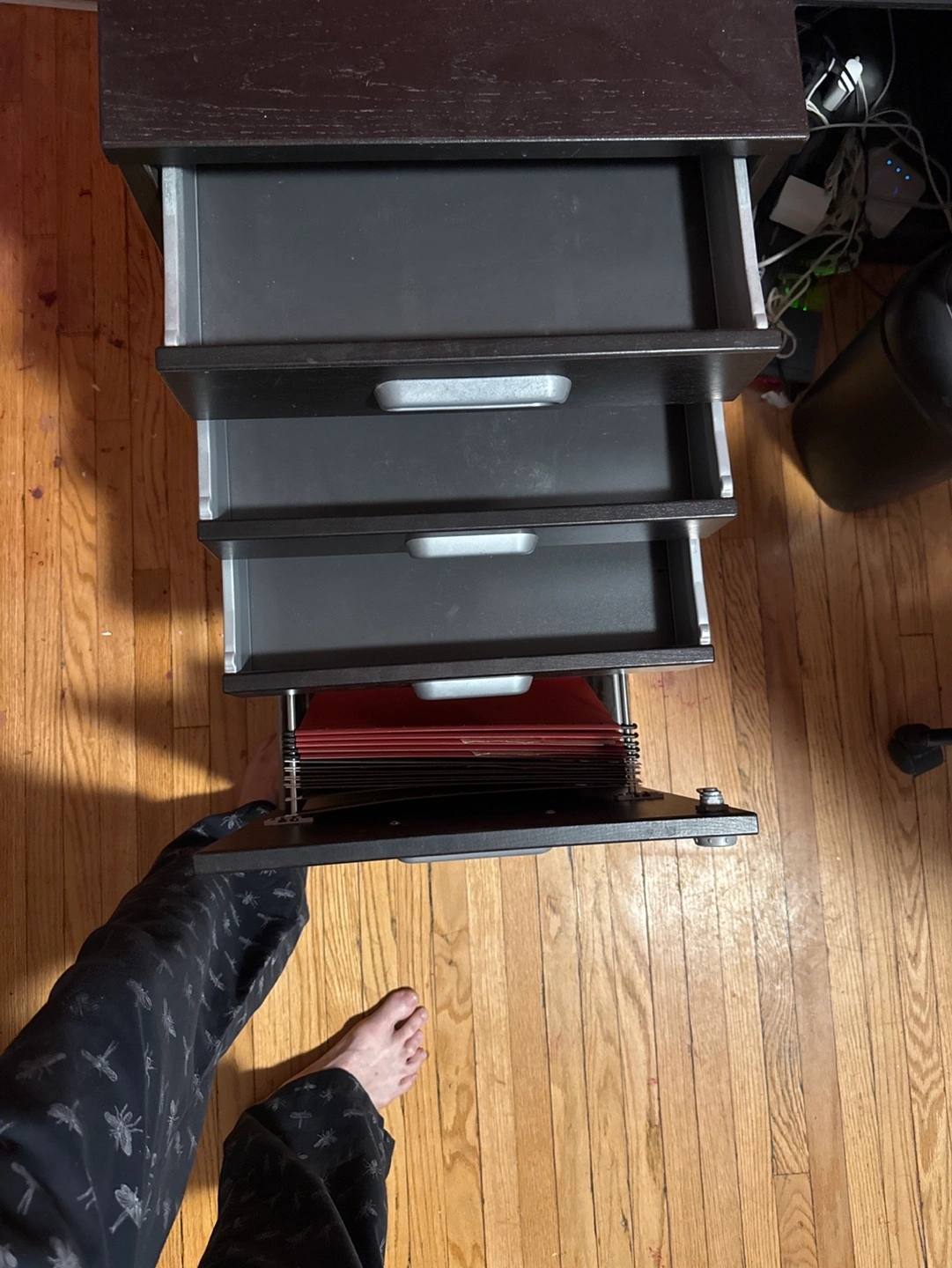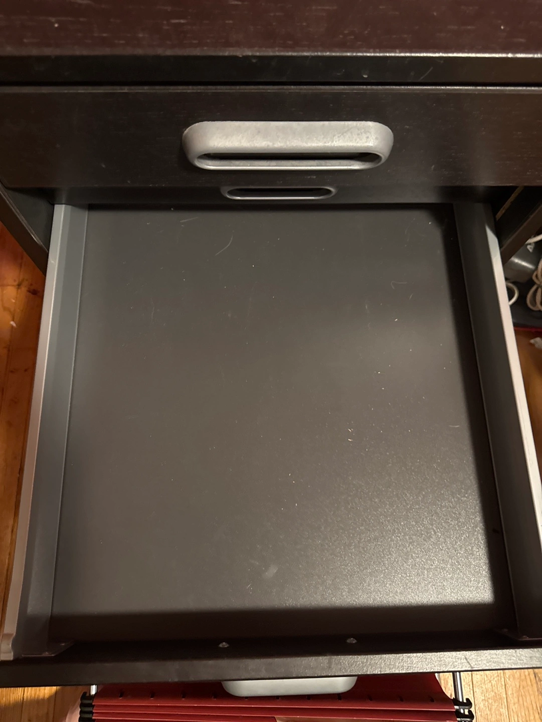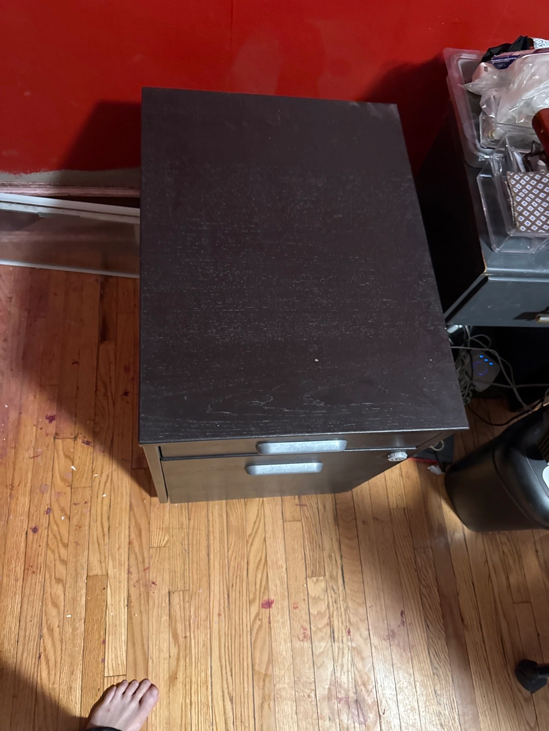 175Dark brown mobile file cabinet. Three drawers, two regular and one with a hanging file system. Metal drawer pulls. Small and compact.