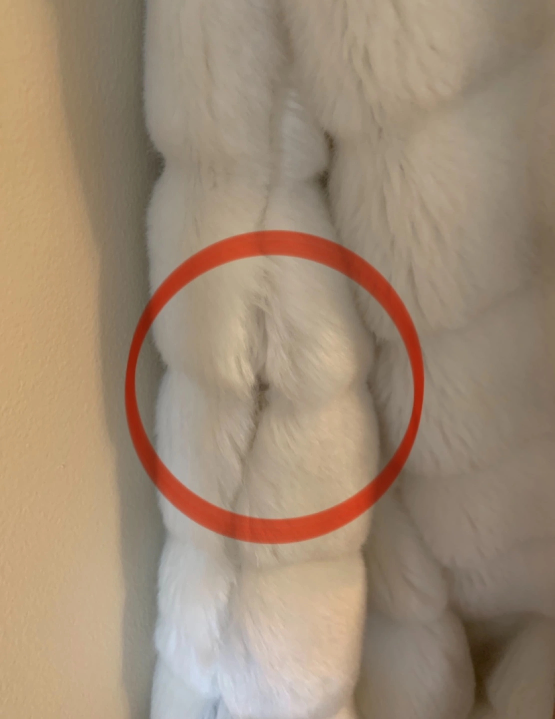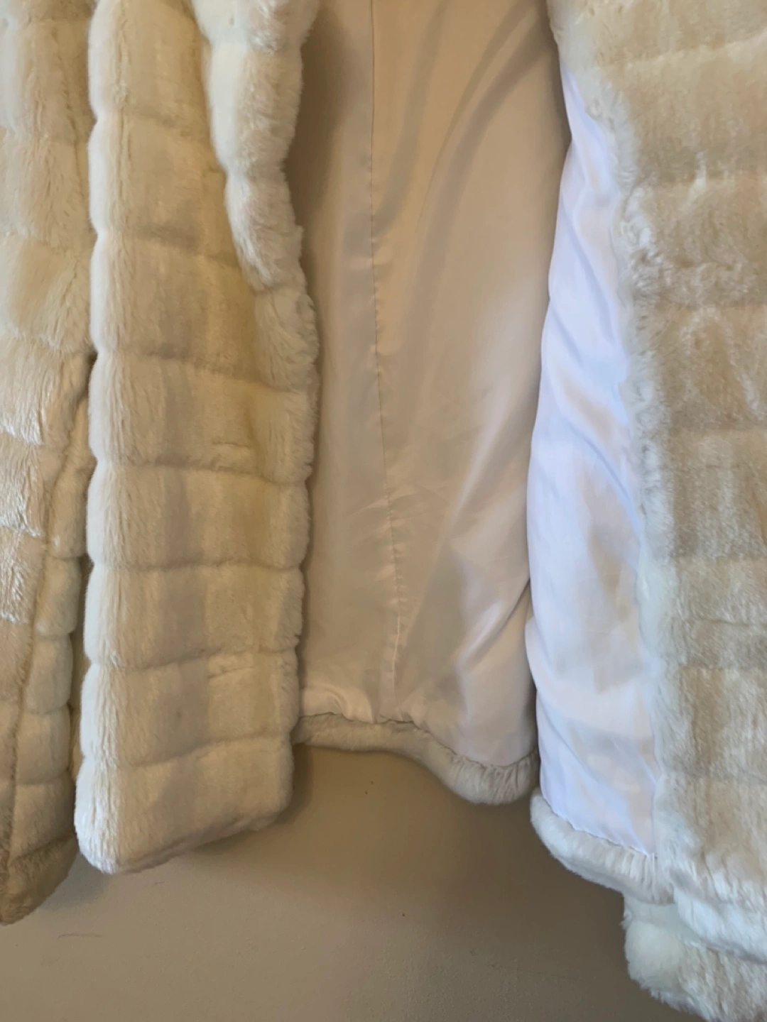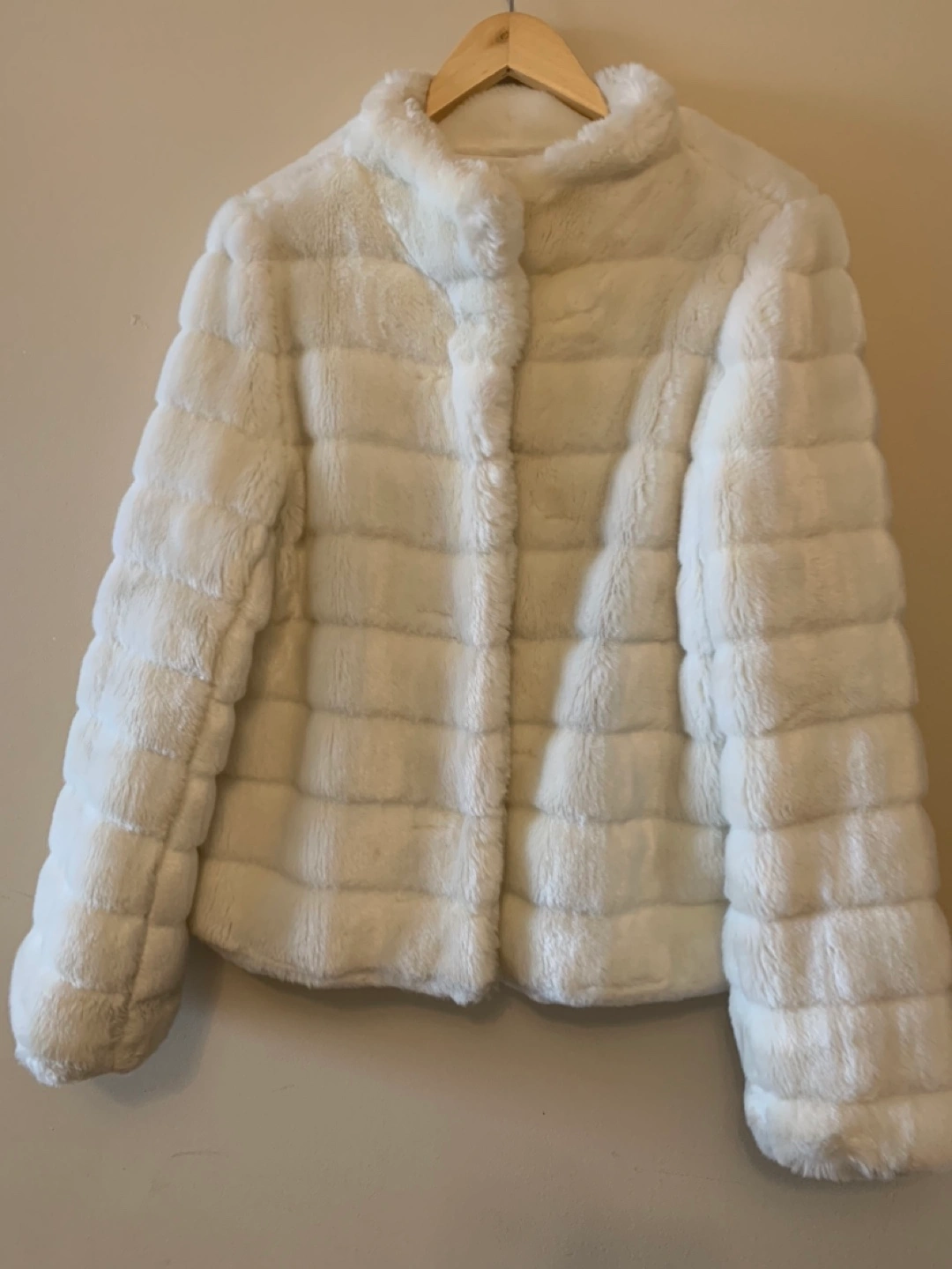 400Cream coloured faux fur jacket. Free size (Usually wear small but this jacket fits me big) Selling for only $10 because of the wear and tear. Please check the pictures with red circle for the tear on right side of jacket. **** No refund/ No exchange*** ***no holds FCFS*** ***pick up only***
