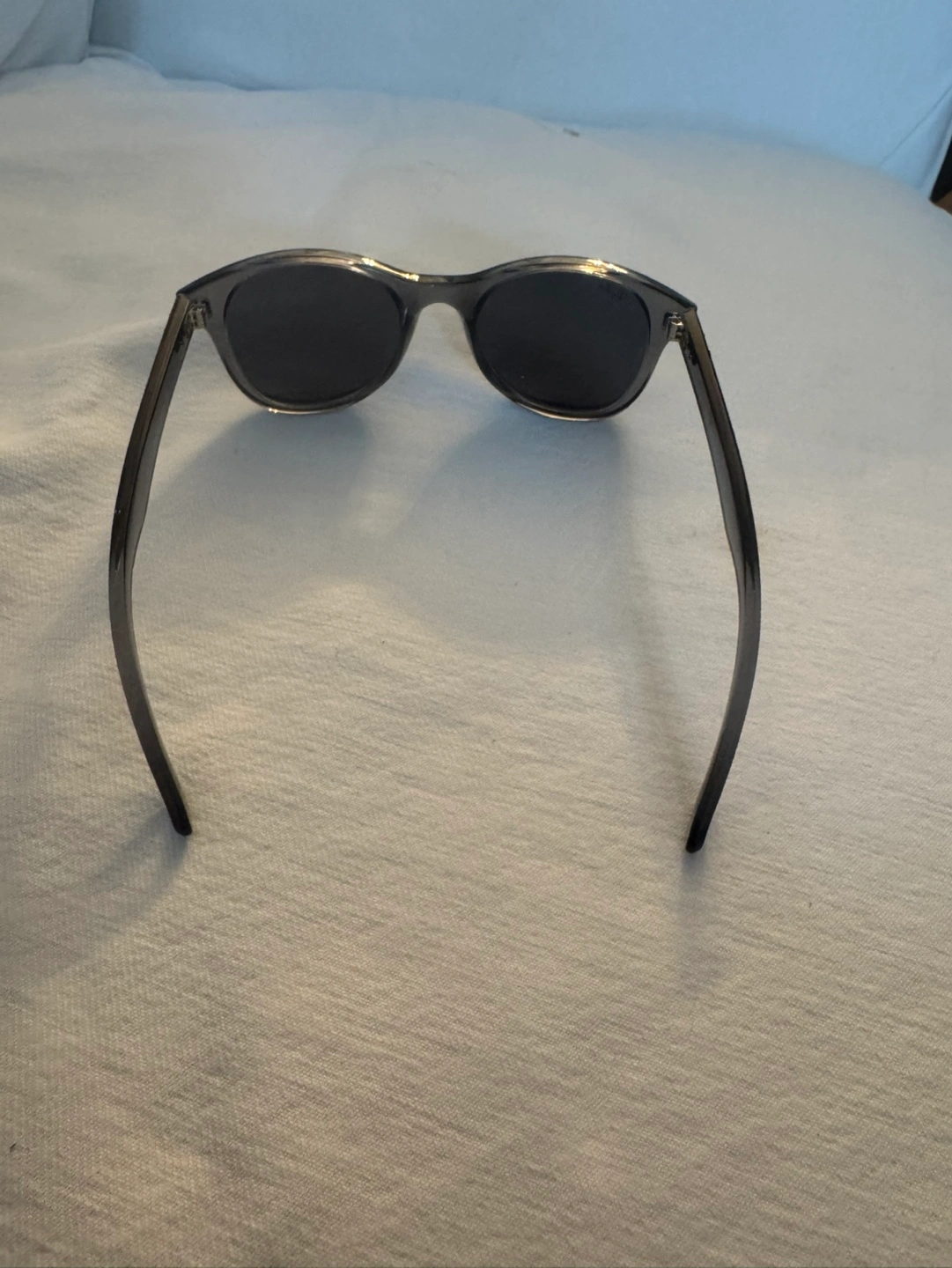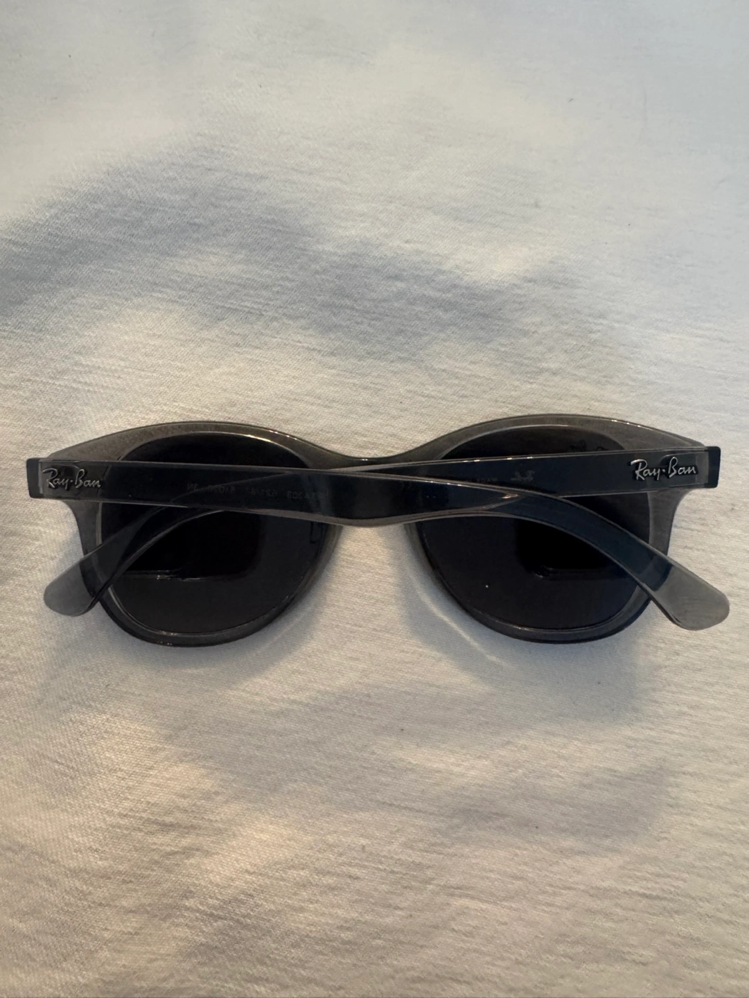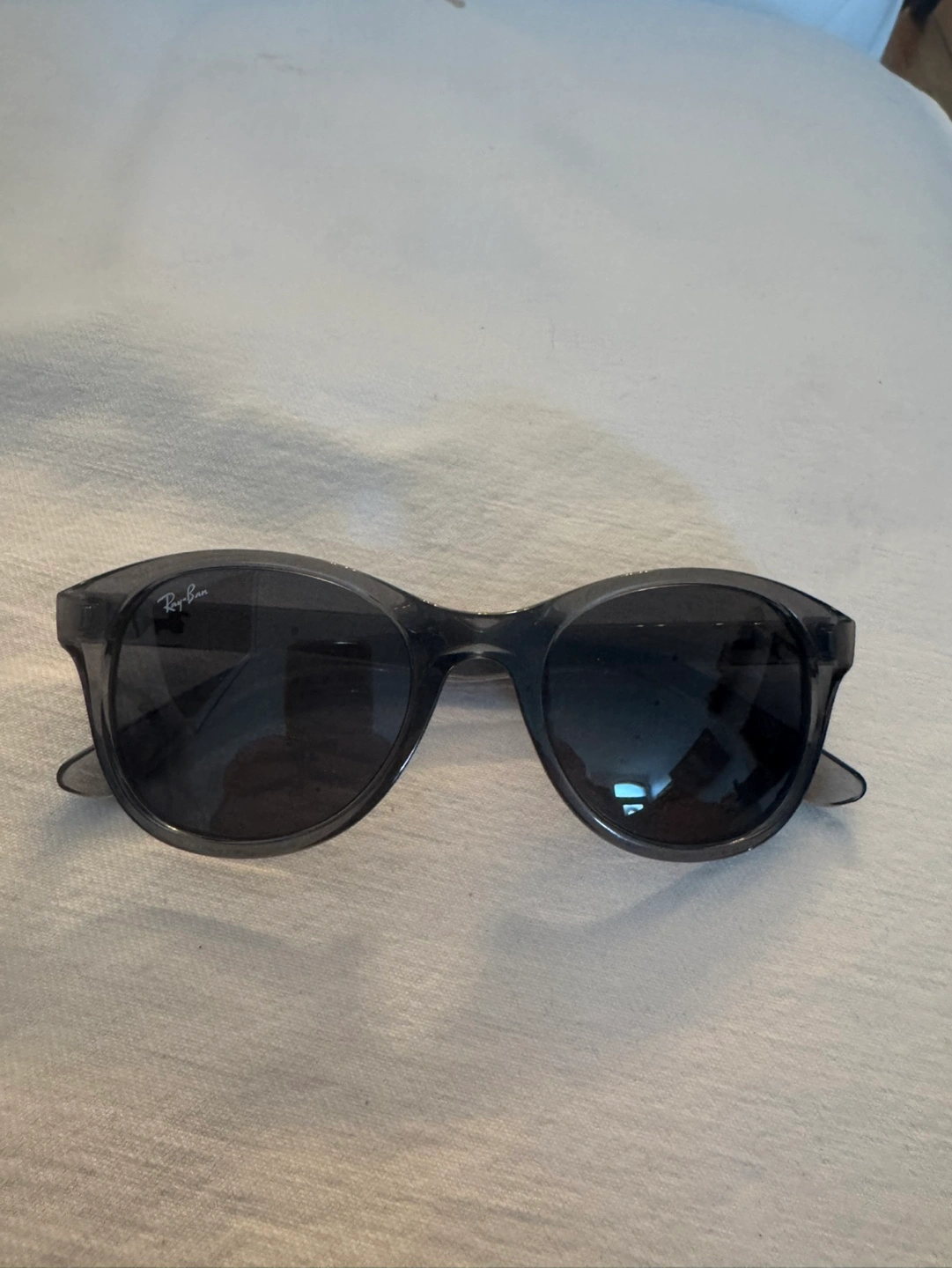 NWOT, Round sunglasses. Grey transparent frames. Dark grey lenses. Ray-Ban branding visible. Pristine as never worn