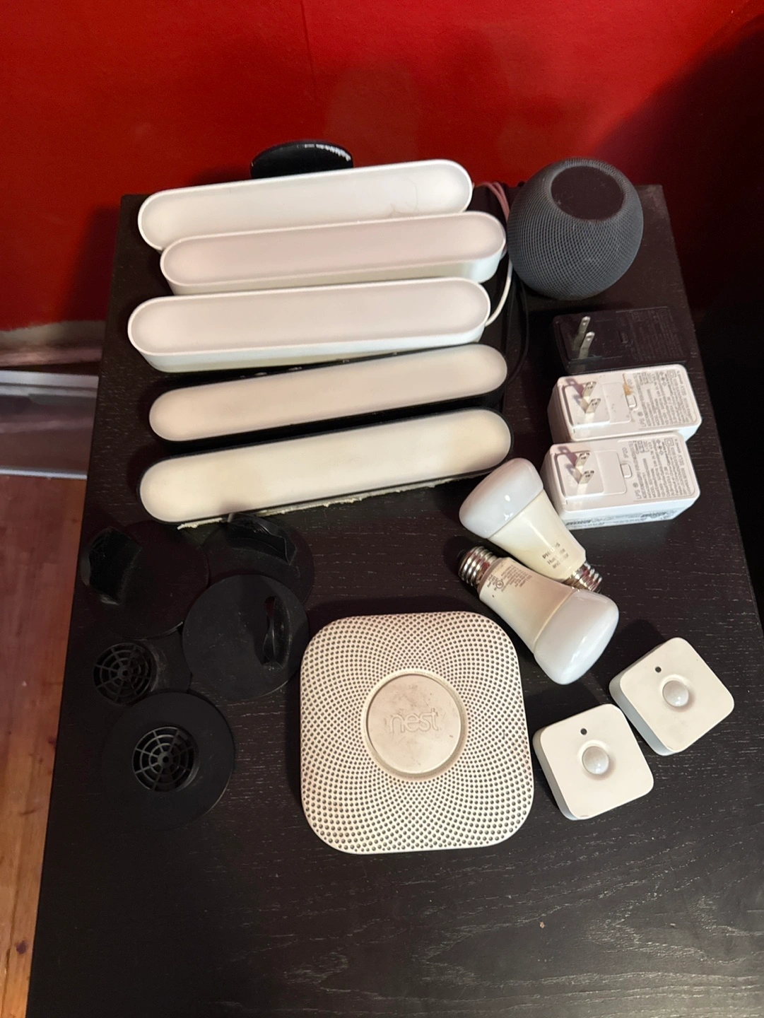 175Smart home bundle includes Apple HomePod mini, Nest Protect smoke & carbon monoxide alarm, Philips Hue Bridge, smart lightbulbs, light bars and additional smart home accessories. Great for automating your home. Some items show minor wear.