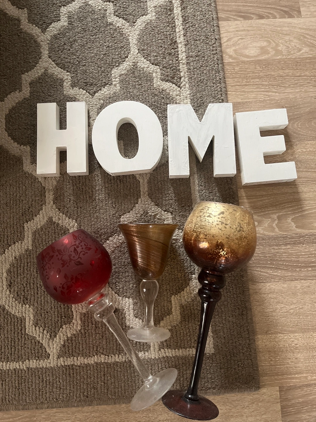 White wooden HOME letters. Three glass votive holders: red, brown, and gold. Perfect for home decor. Price for eveything.