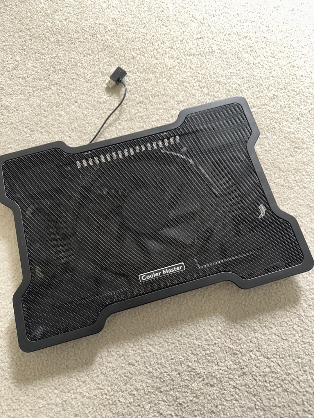 USB powered laptop cooling pad. Features a built-in fan. Good condition. Compact and portable.