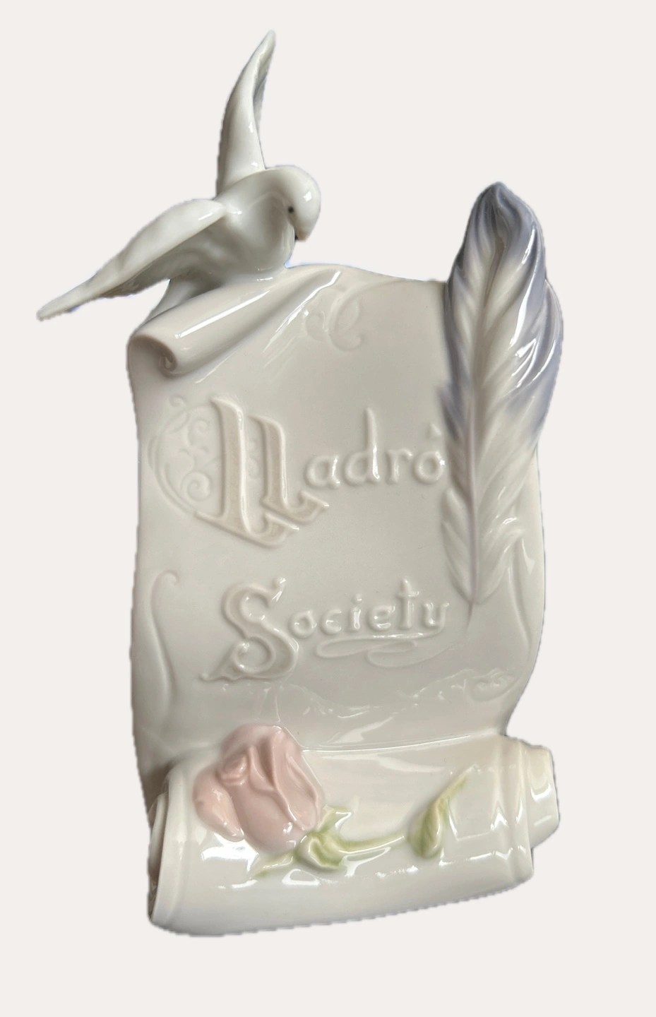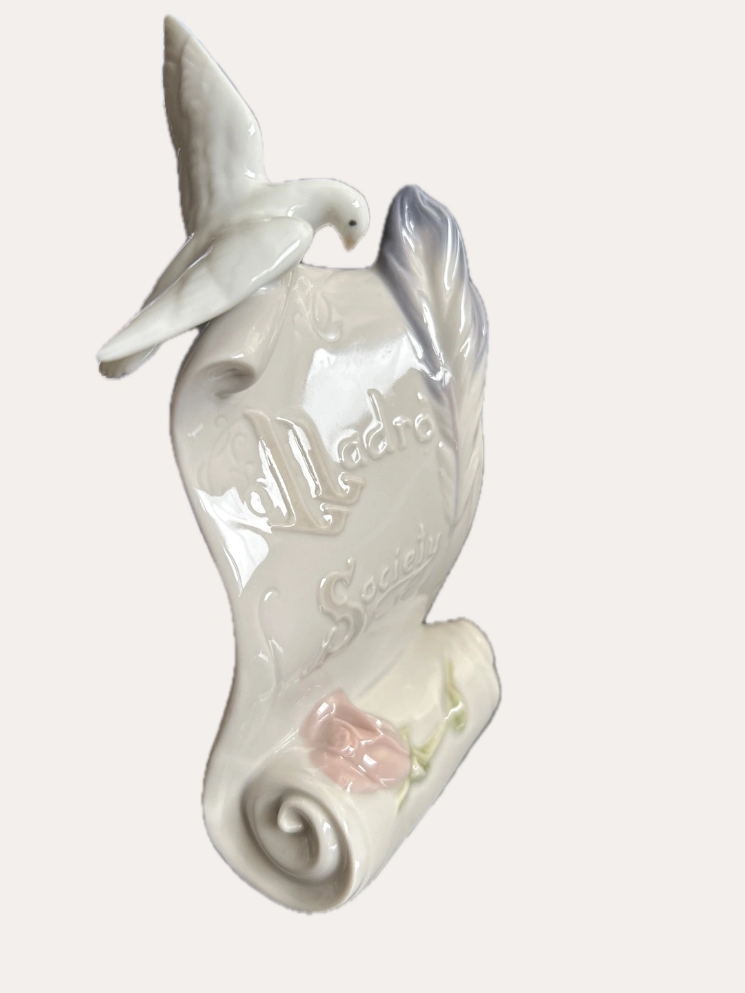 Lladró Collectible porcelain figurine. Features a dove perched on a scroll with the Lladró Society logo. Hand-made in Spain. Number 285.