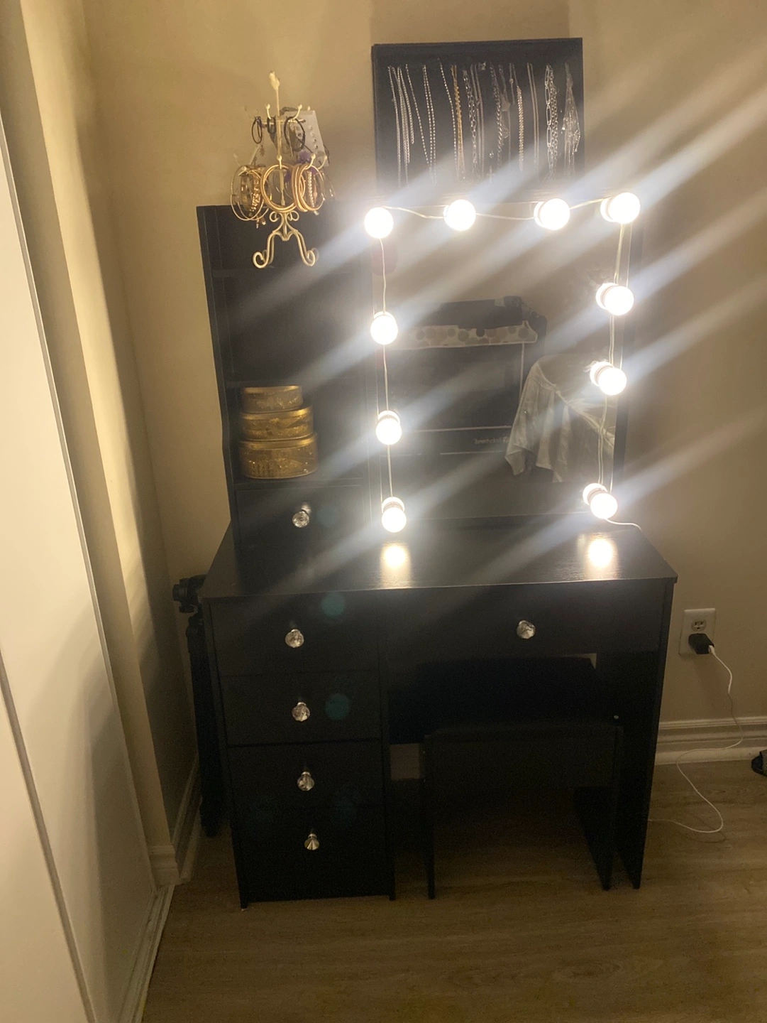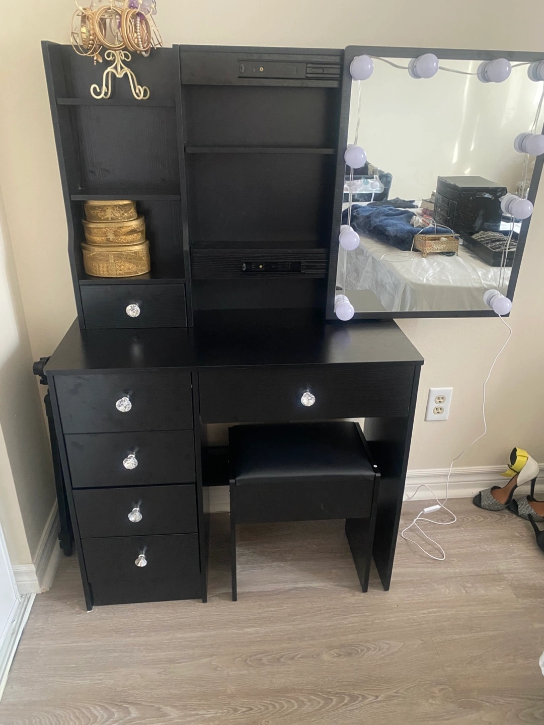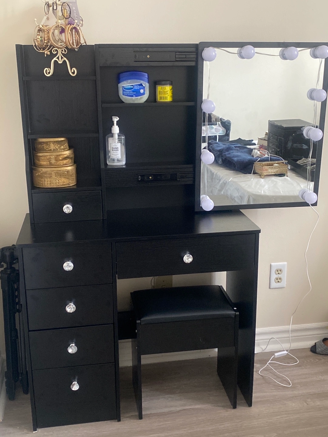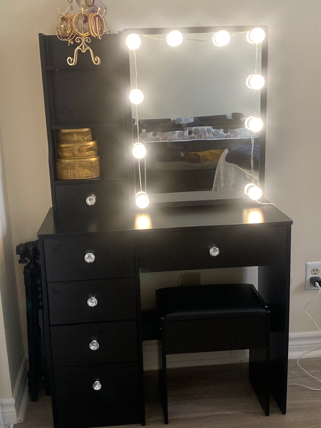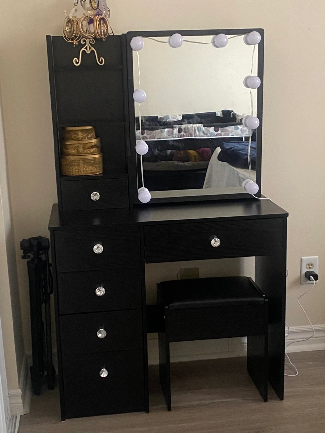 Stylish black vanity set. Features a large mirror with integrated LED lights. Includes a spacious tabletop, five drawers for storage, and a cushioned stool. Perfect for makeup application or jewellery storage.