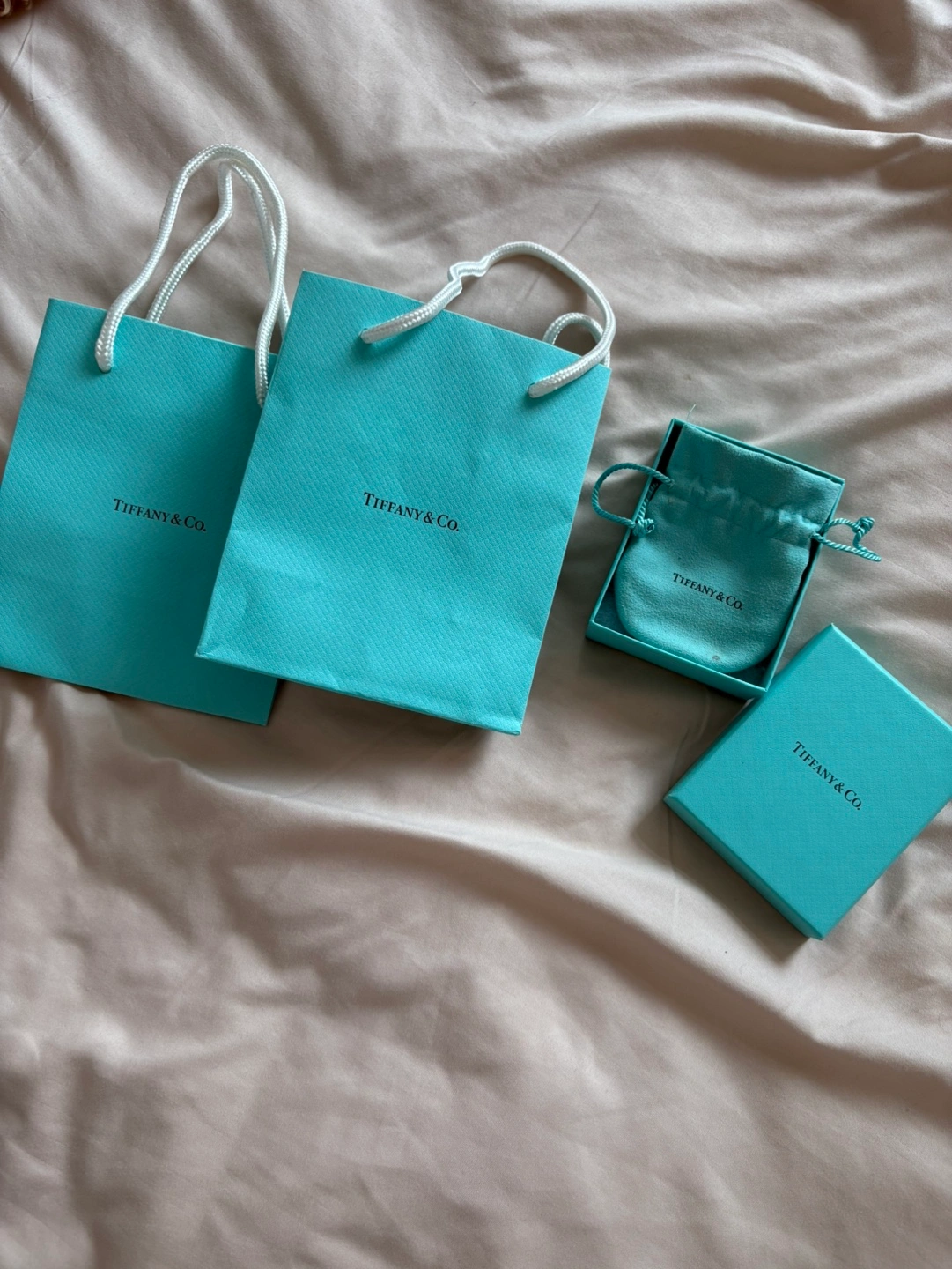 Two Tiffany & Co. shopping bags, one small Tiffany & Co. gift box with a pouch, and one larger Tiffany & Co. gift box. Perfect for gifting or storing jewellery.