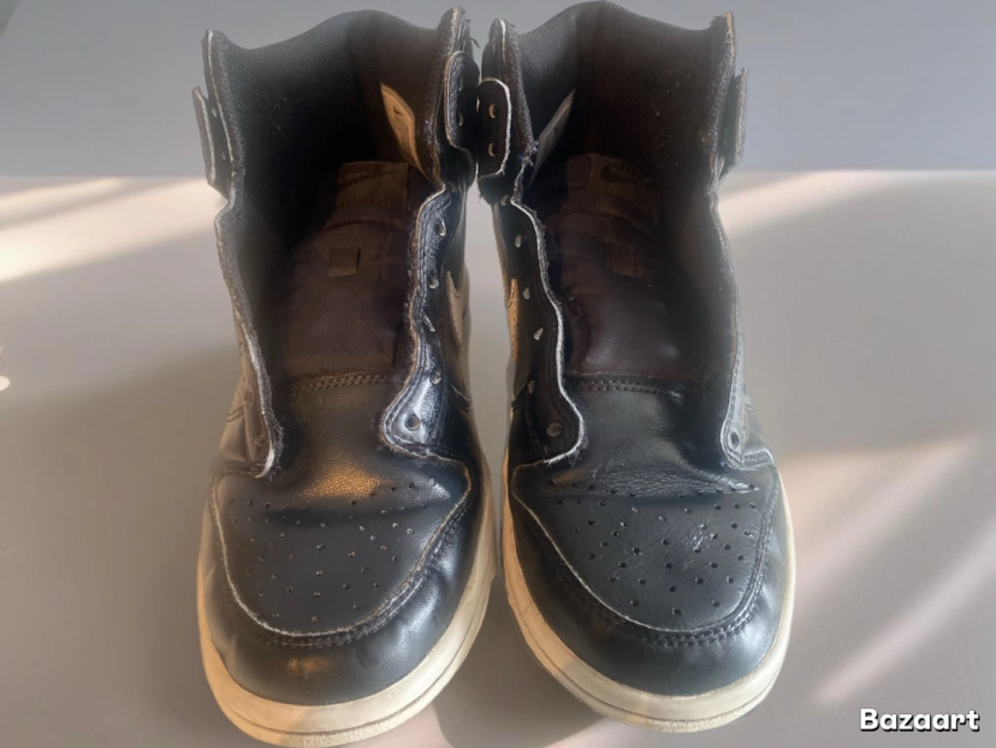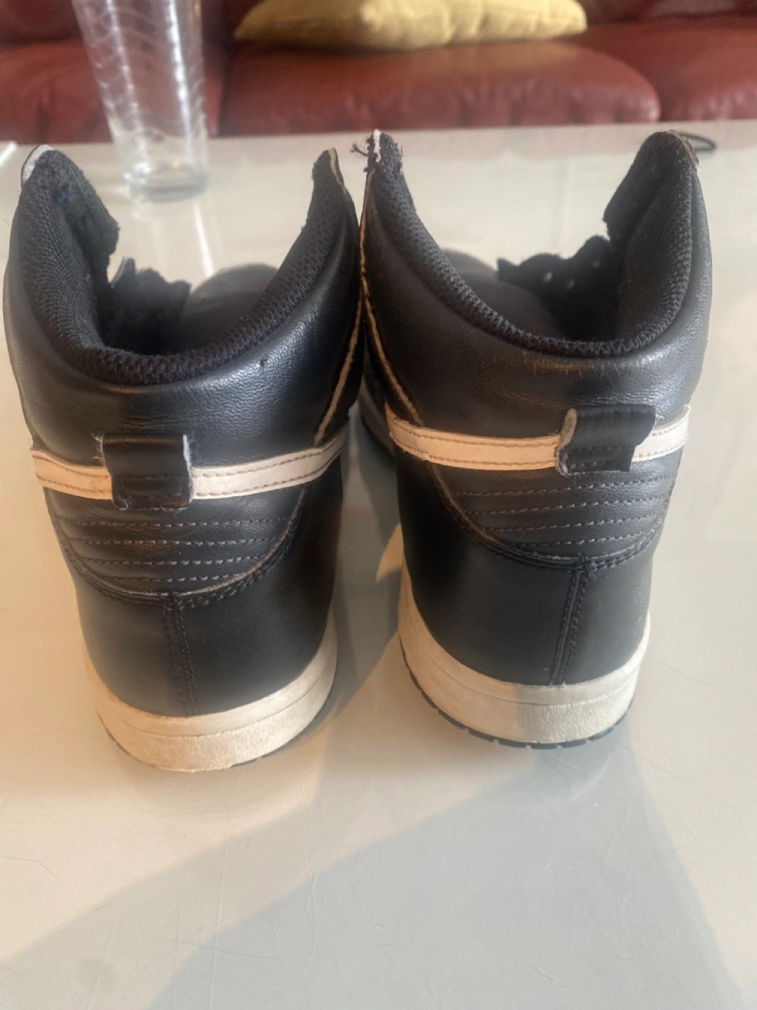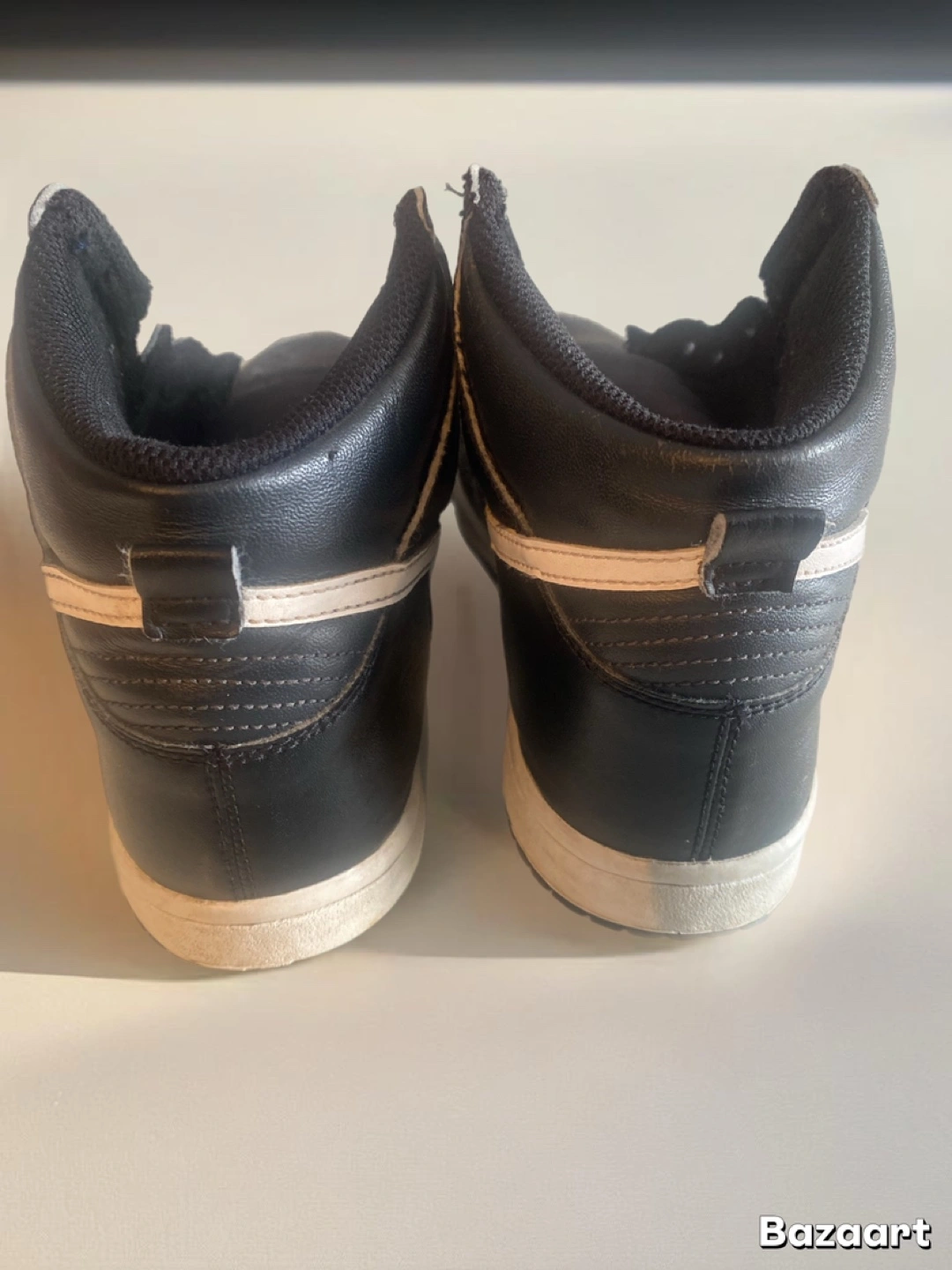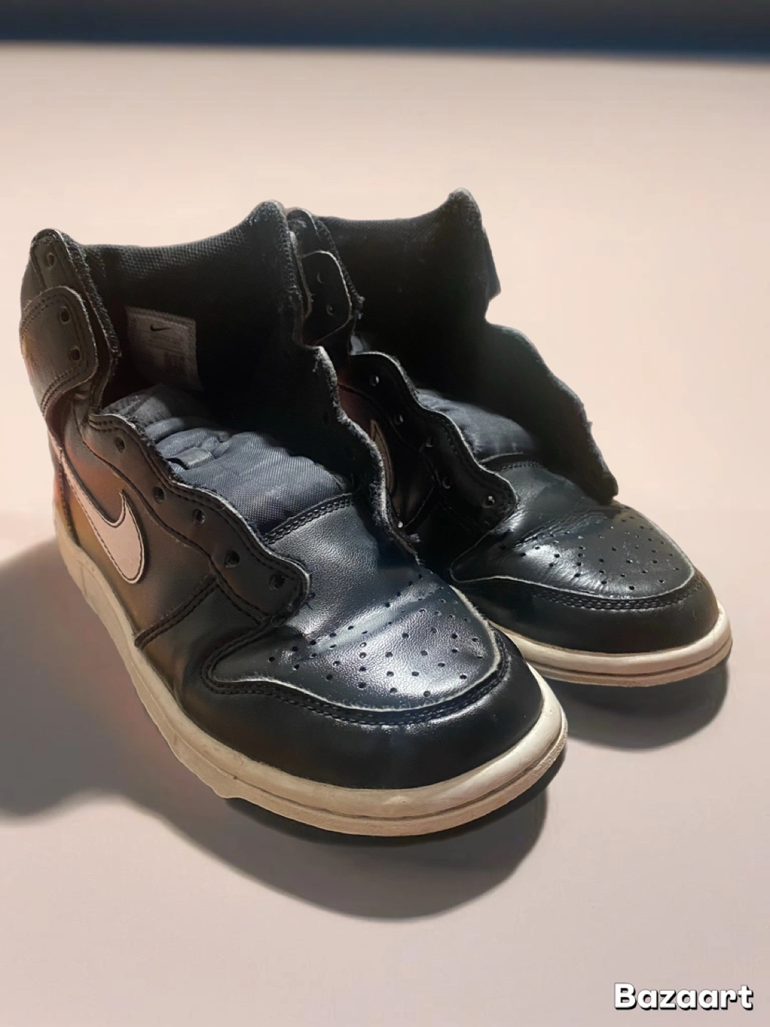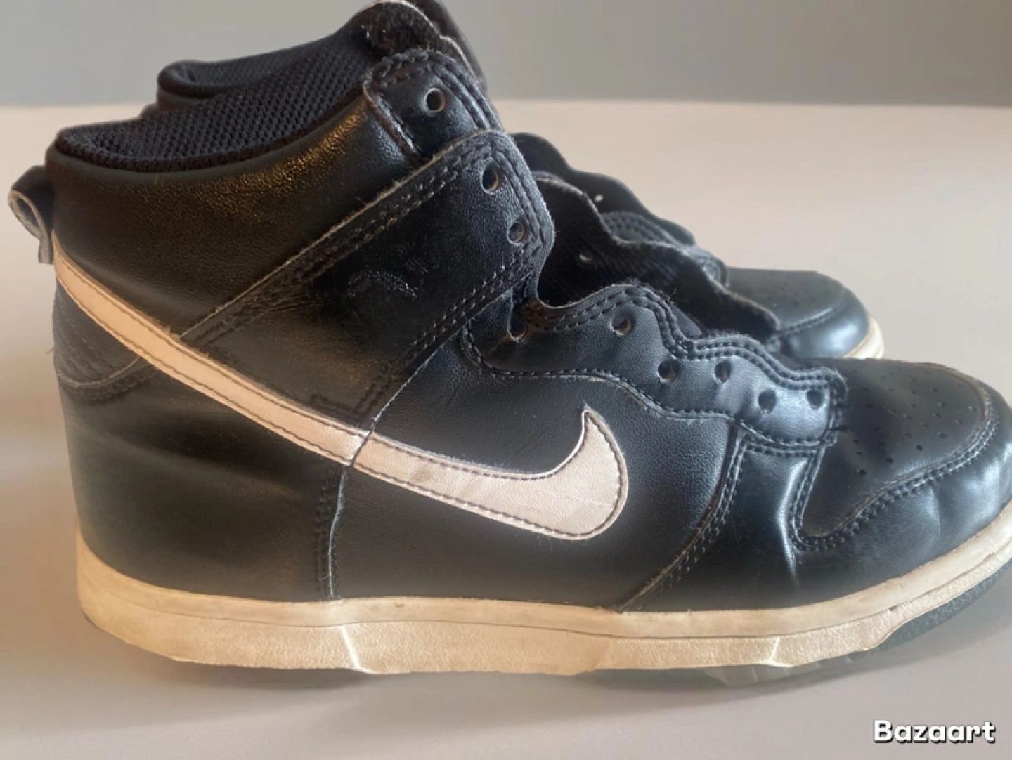 Pre-owned Nike Dunk High sneakers. Black leather upper, white swoosh. High-top design. Good for casual wear. Size 5y