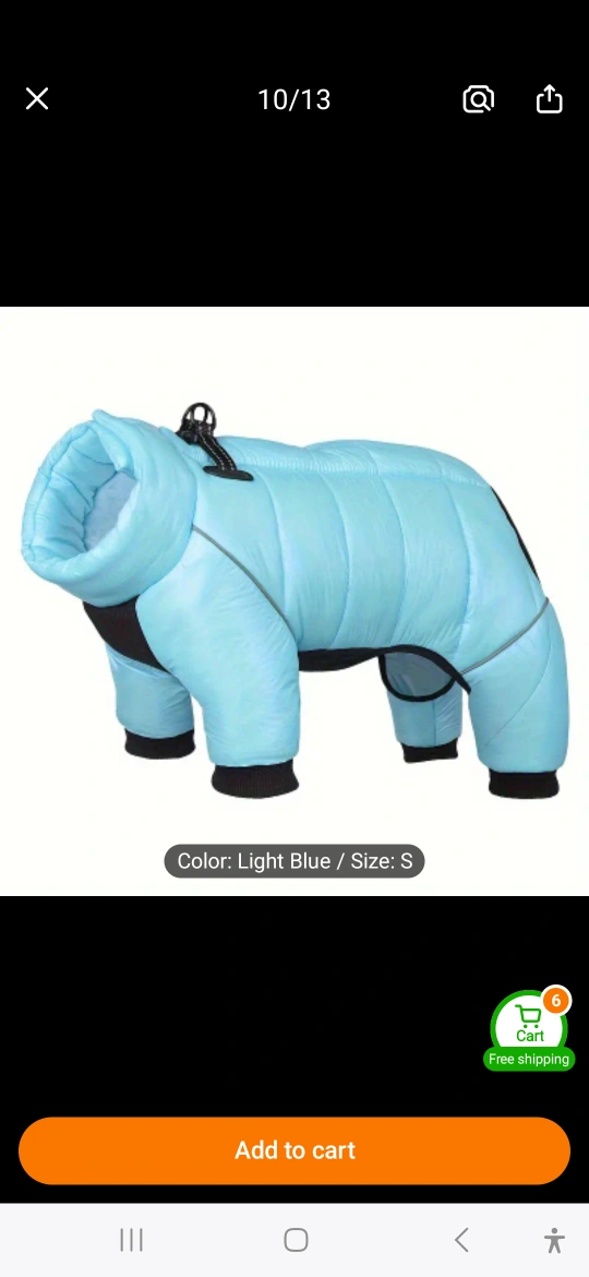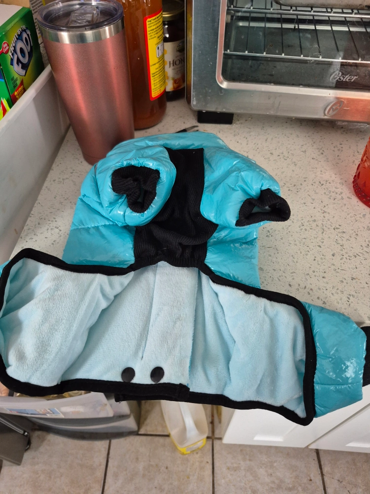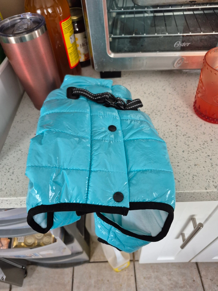 new dog puffer jacket. Size small. Features a light blue quilted outer shell, black accents, and a soft fleece interior. Includes leash attachments. Perfect for keeping your furry friend warm during the colder months.