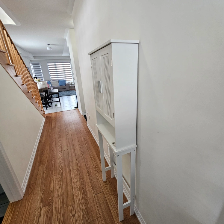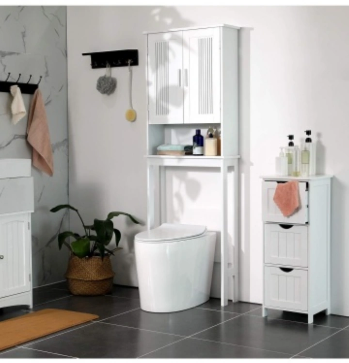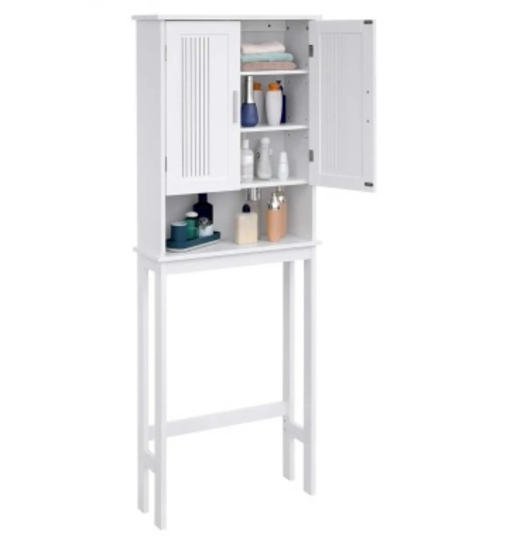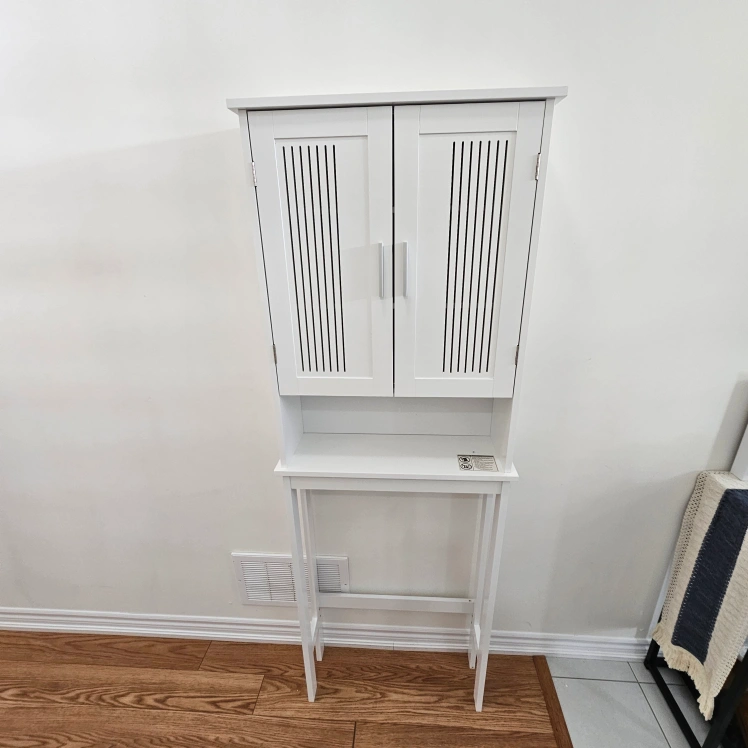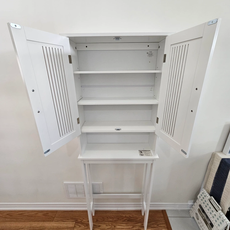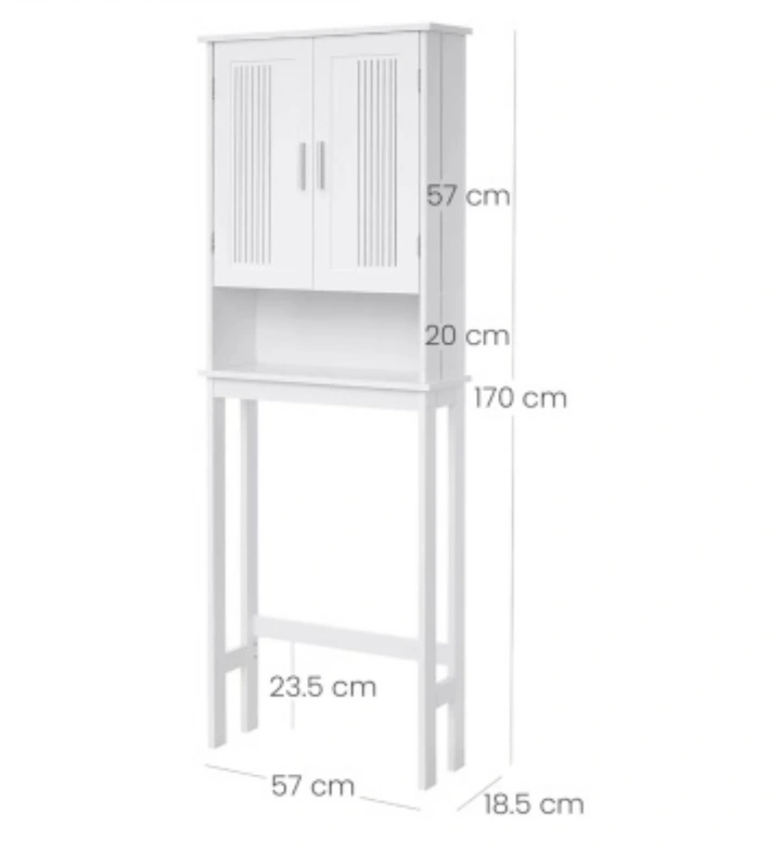 87Freestanding bathroom cabinet. Two doors, open shelving. White finish. Minor cosmetic damage to one corner. Approximate dimensions: 57cm wide x 170cm high x 23.5cm deep.