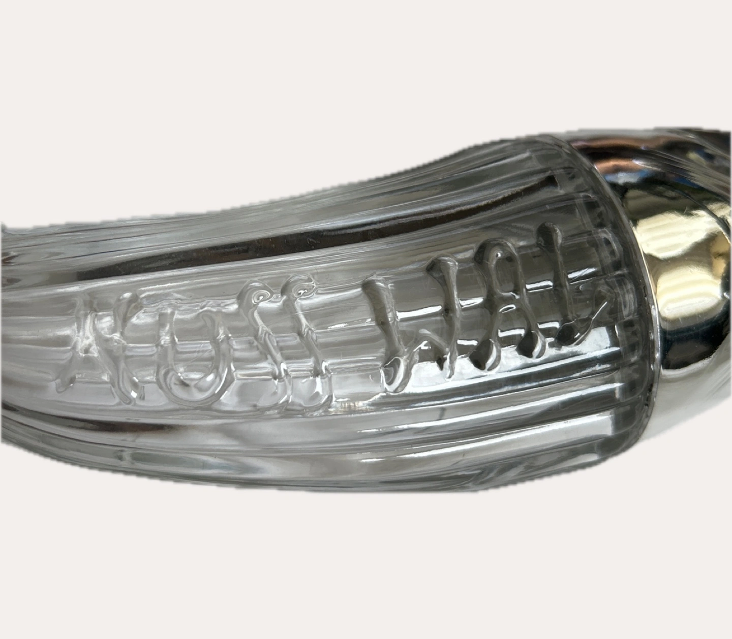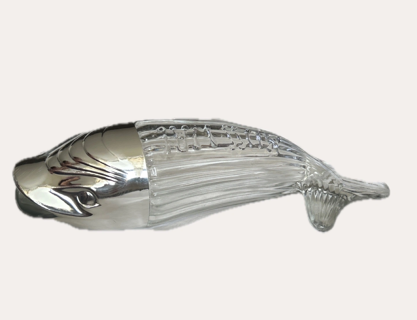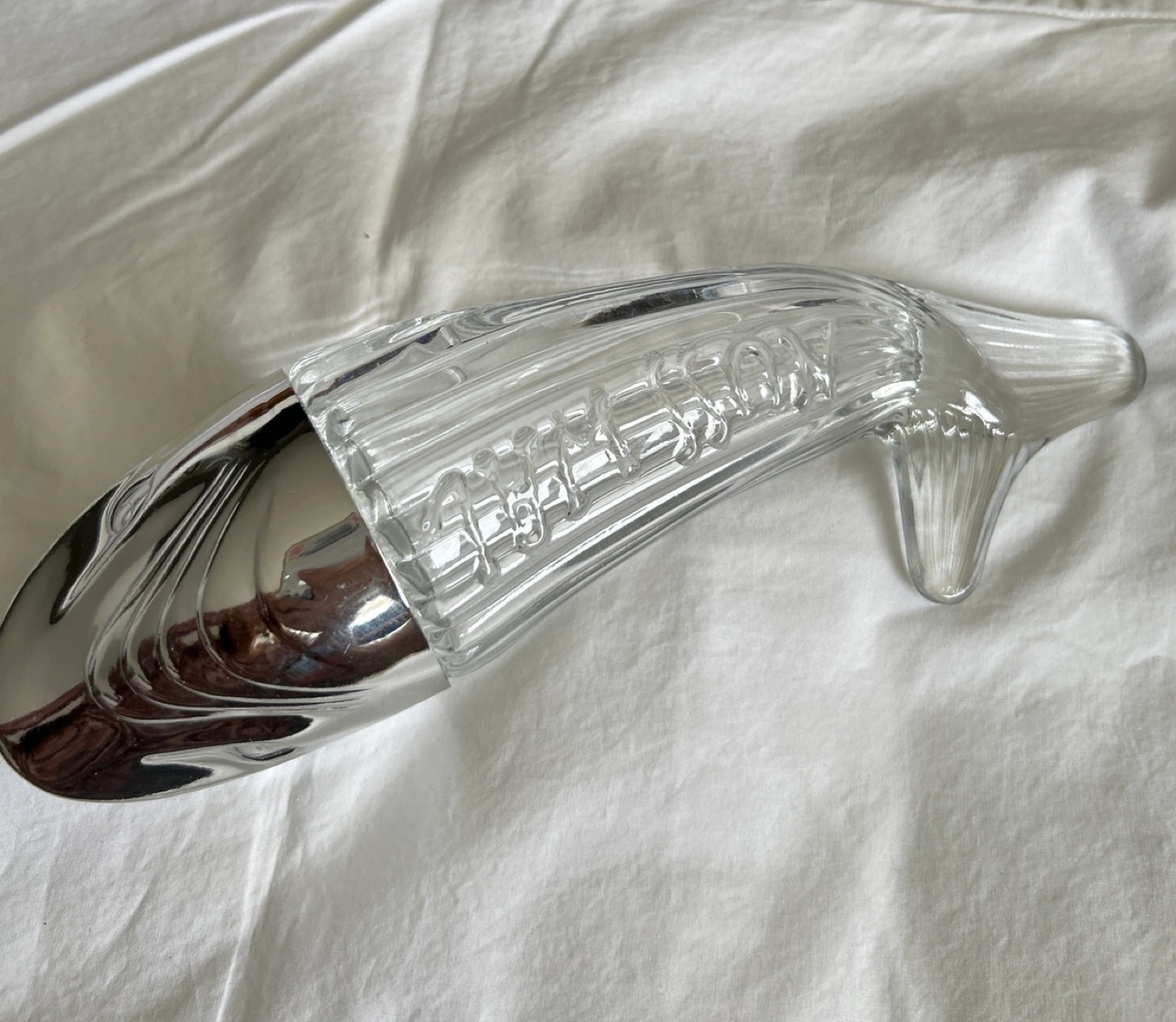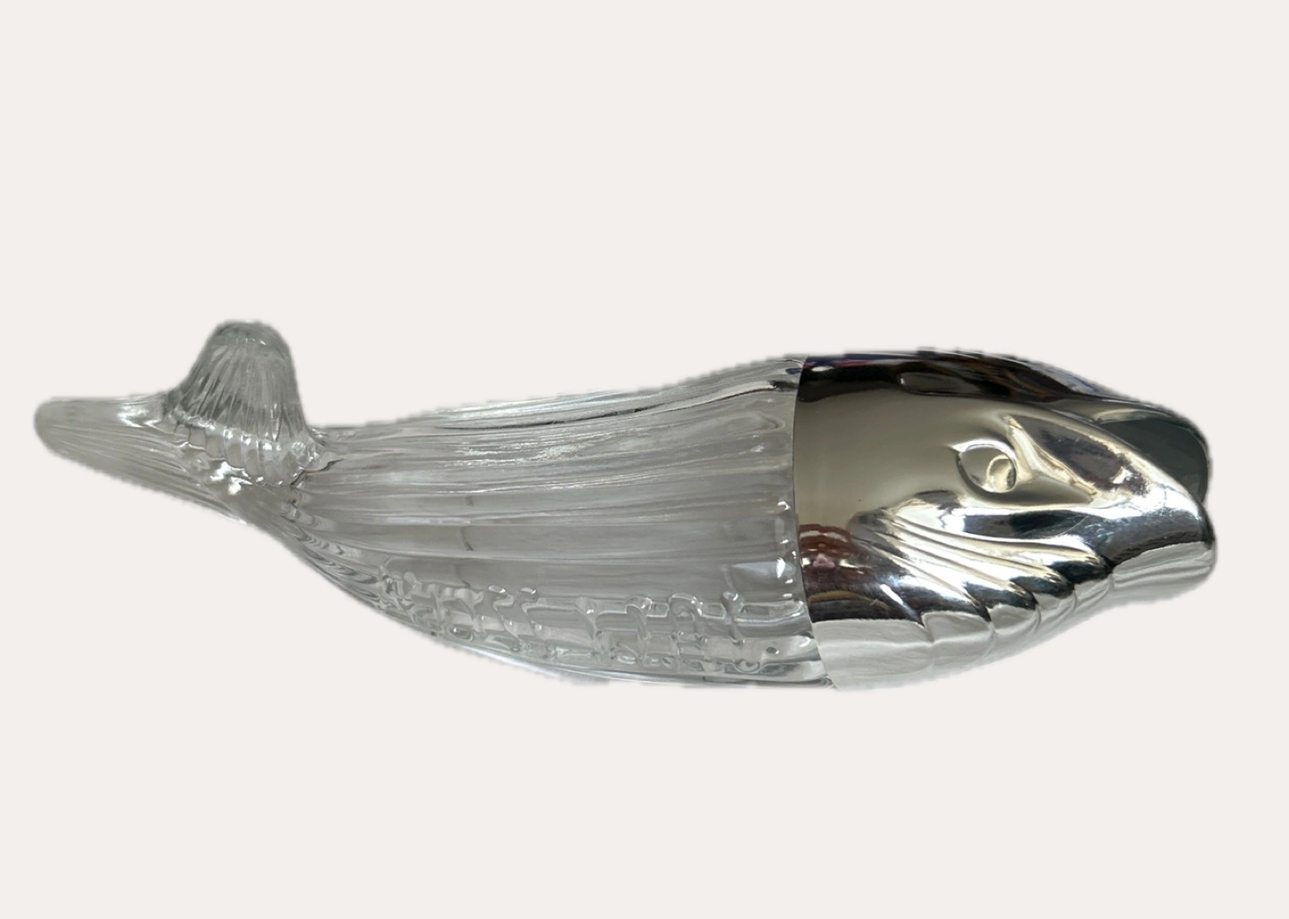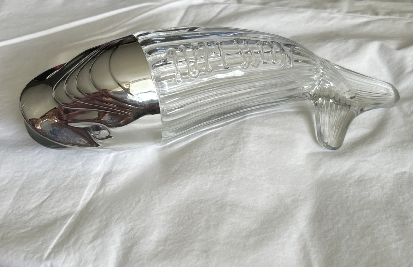Clear glass fish-shaped nuts/candies dispenser. Silver-tone metal of the fish head. Ribbed glass body. Nuss Wal (Whale) print embossed on the side. Good quality and in very clean good condition. No marks or brand name. Smoke/Pet free home Cash/Pick-up only