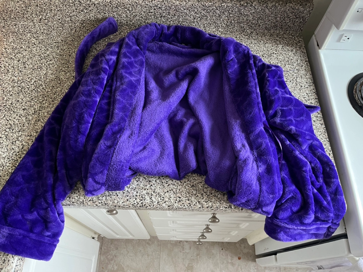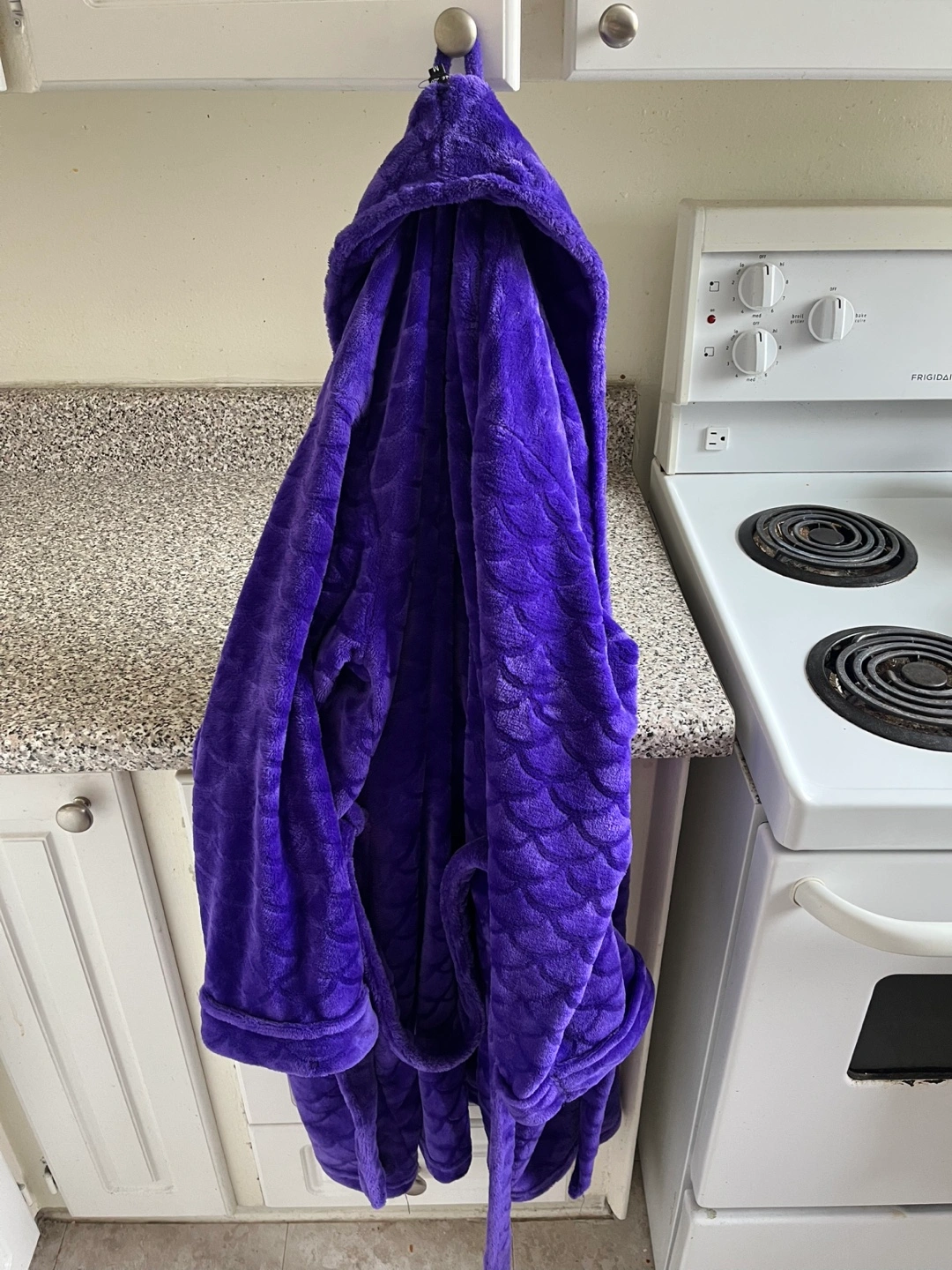 Women's purple plush robe. Size medium. Features a tie waist. Soft and cozy material. Scalloped pattern or mermaid pattern