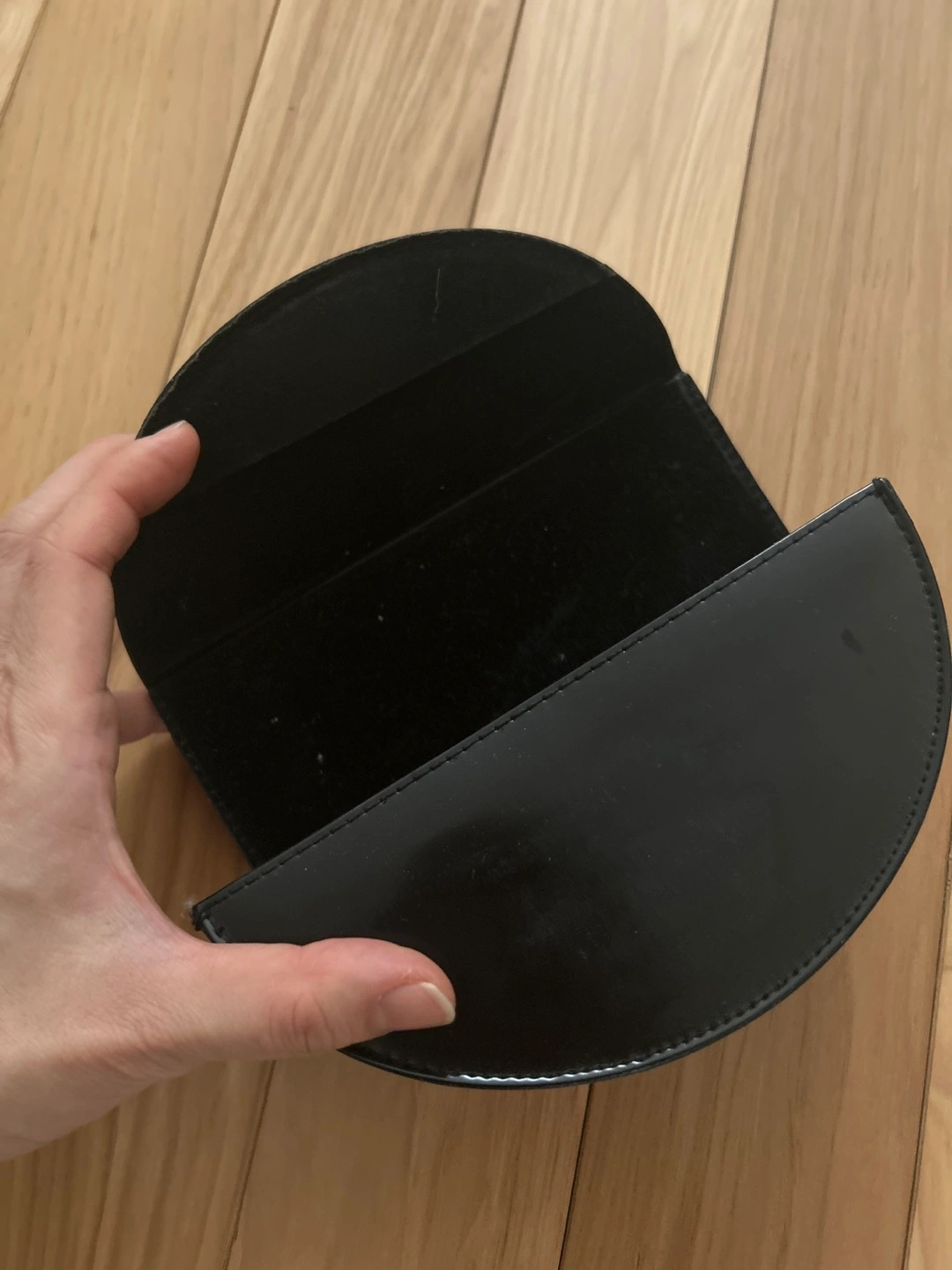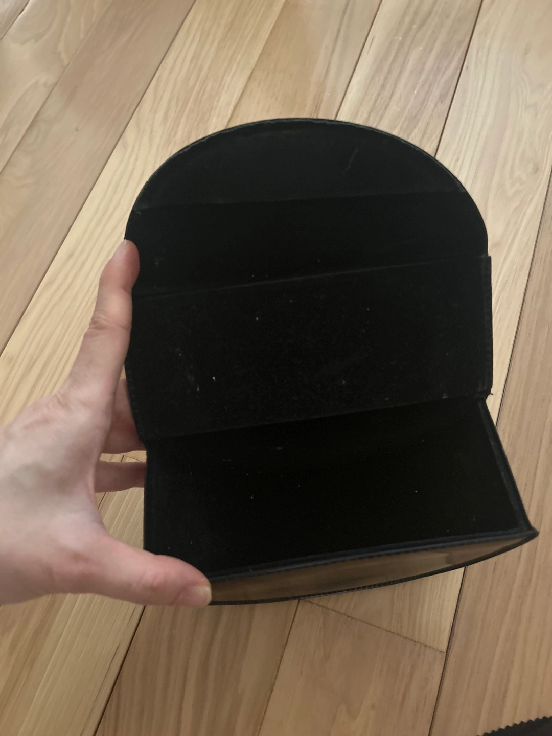 Black semi-circle hard shell sunglasses case. Velvet interior. Perfect for storing and protecting your favorite shades.