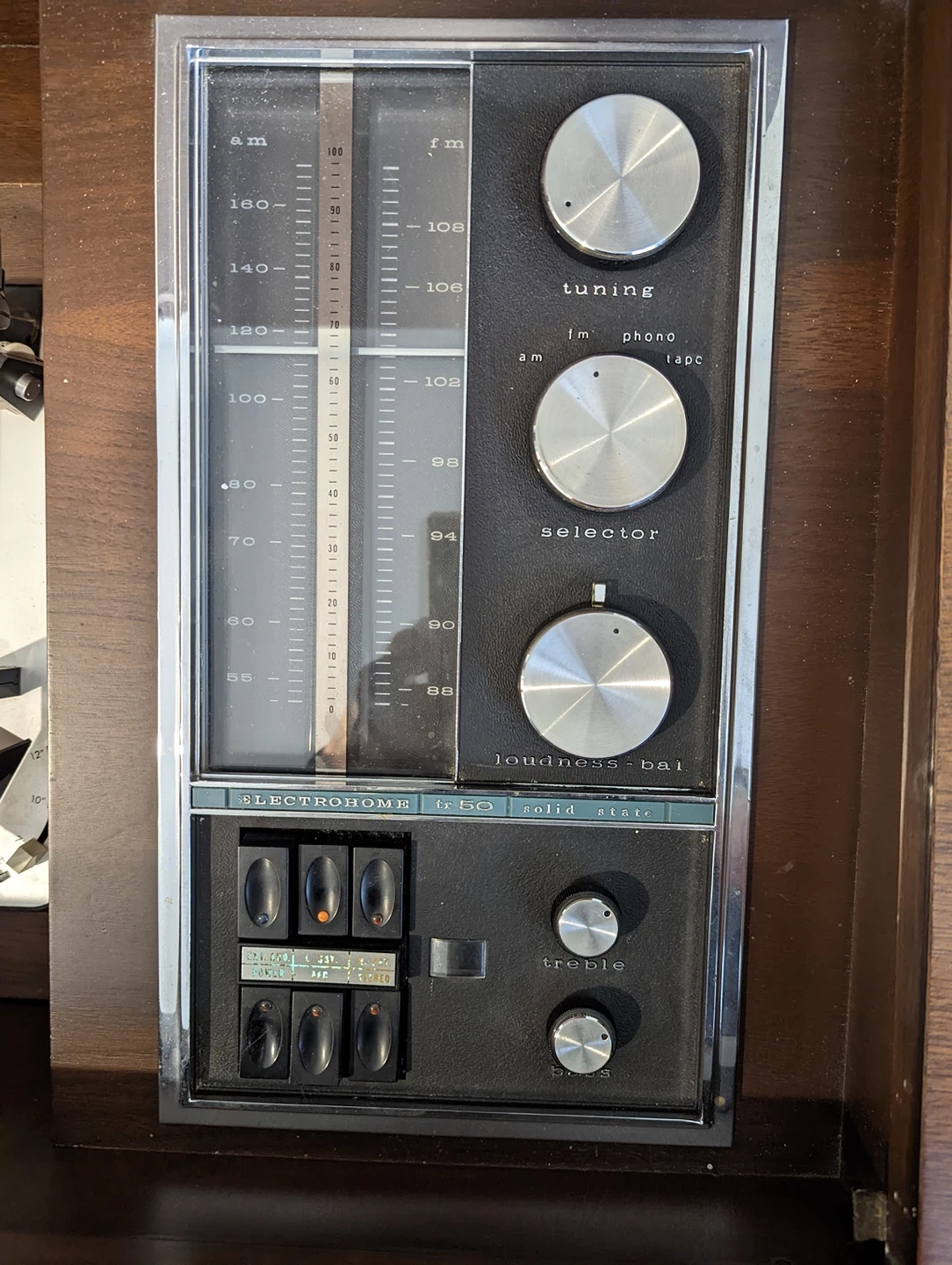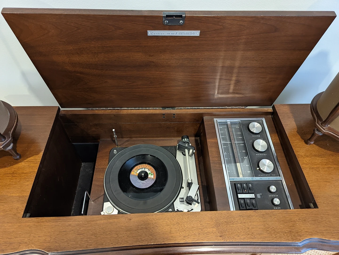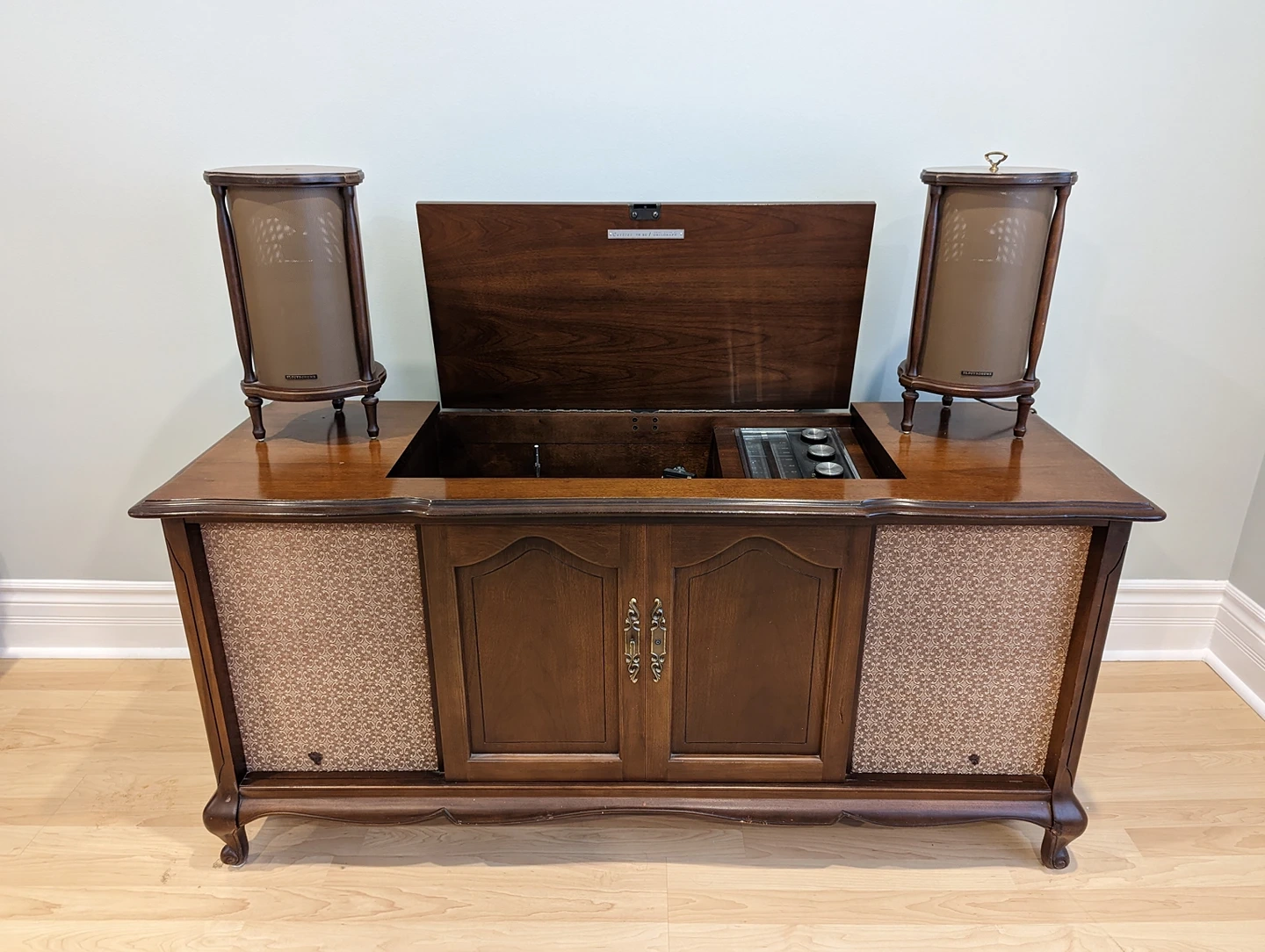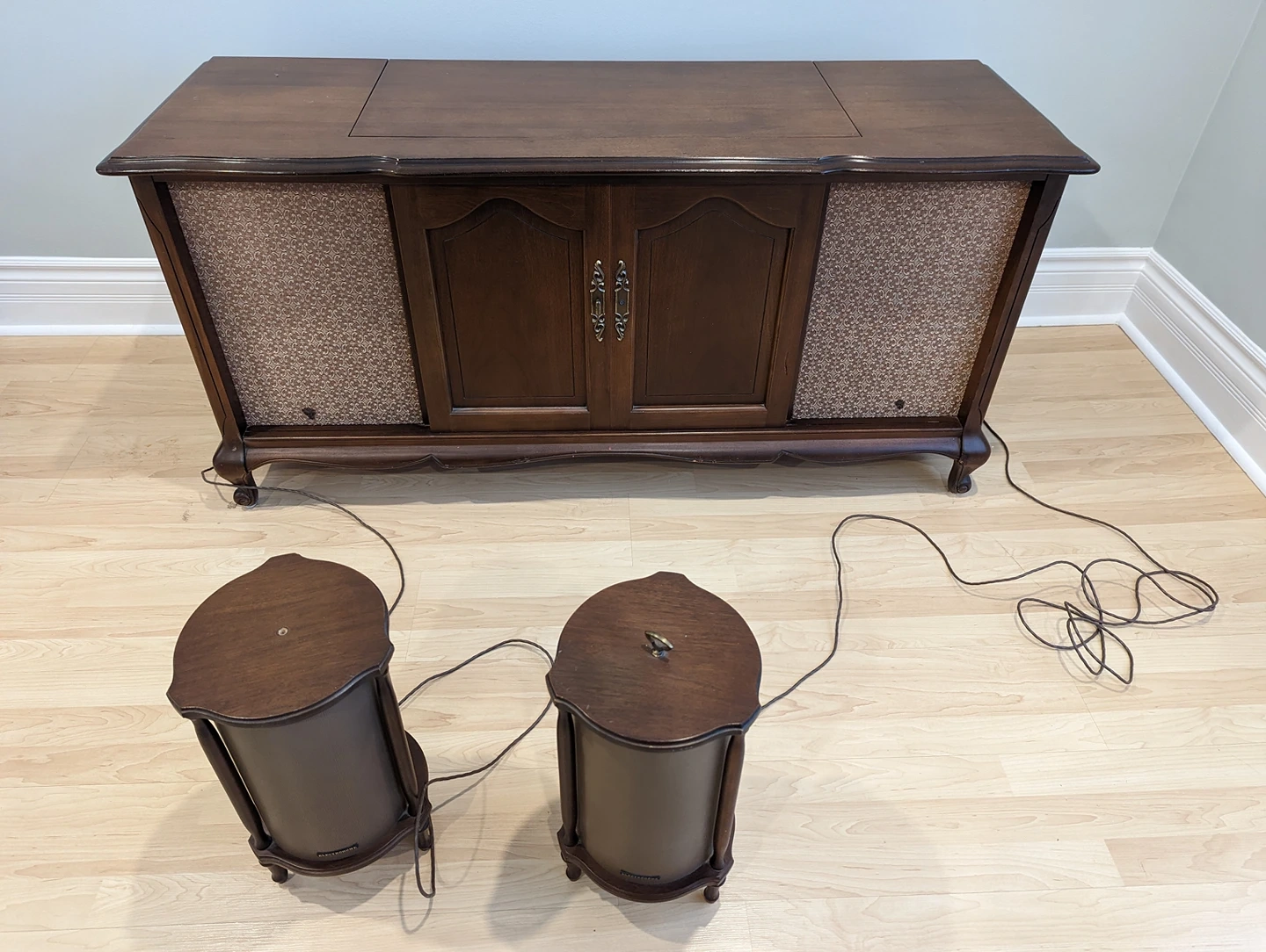 A real room feature. Beautiful, vintage functional stereo and record player with satellite speakers. 50+ years old, Canadian made, walnut build. All speakers work and sound nice and warm. Radio works, tuning dial is a bit stiff (I've been loosening it up a bit). All pots work, but need a cleaning. Front cabinet doors slide to cover fabric speaker fronts. Record player works, but the needle needs replacing. Spot for records inside cabinet. Original manuals and brochures included. Has aux and tape i/o. Some surface damage. Can send more photos upon request. In YouTube link: sound of all speakers working; two small hardware features have come off but one just requires a screw. Both pieces are with the package; some dents on facade. Pick up only. $293 OBO.