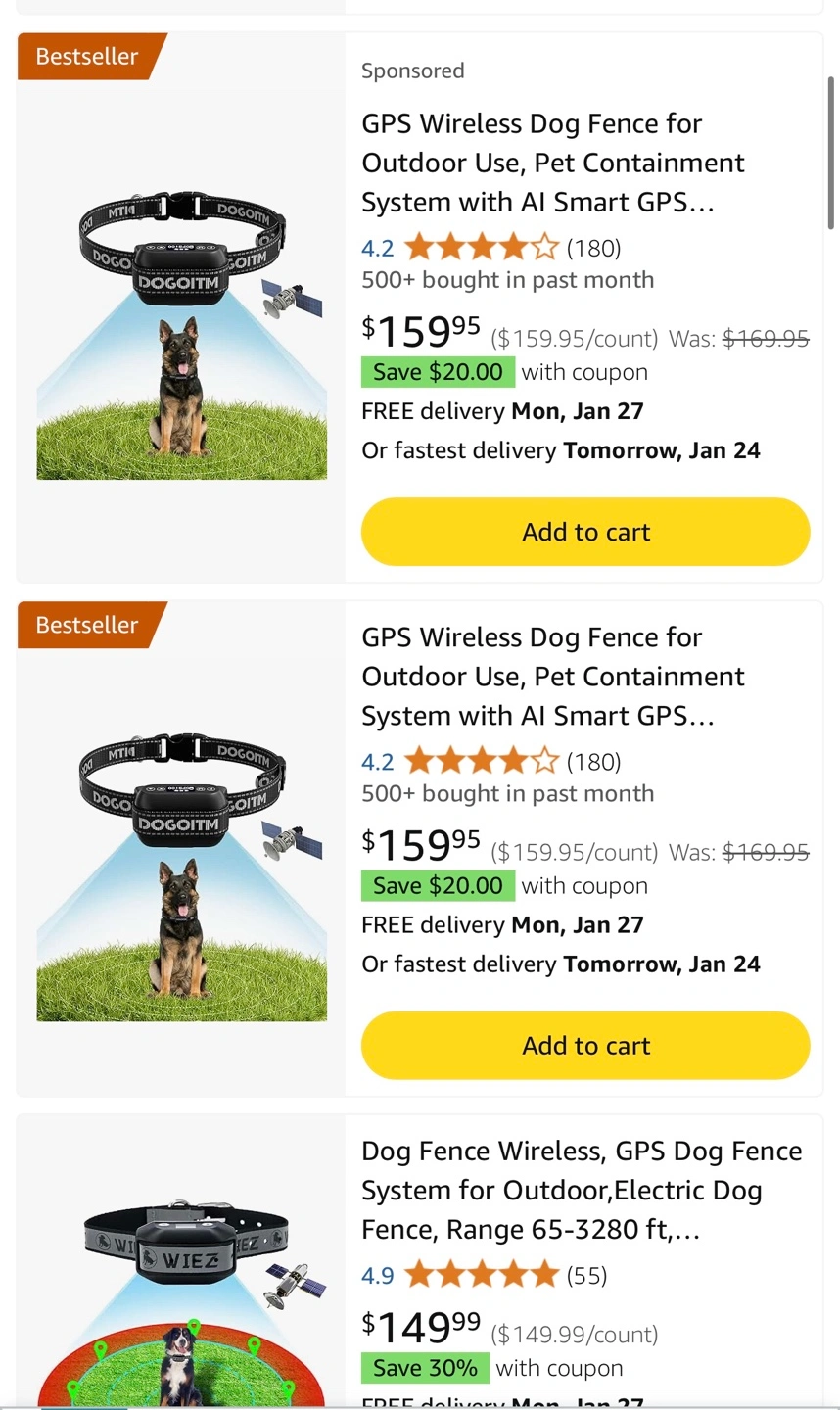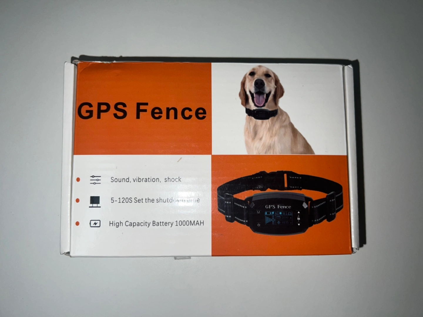 GPS dog fence. Includes collar, charging cable, and extra straps. Shock, vibration, and sound options. 1000MAH battery. Set shutdown time.