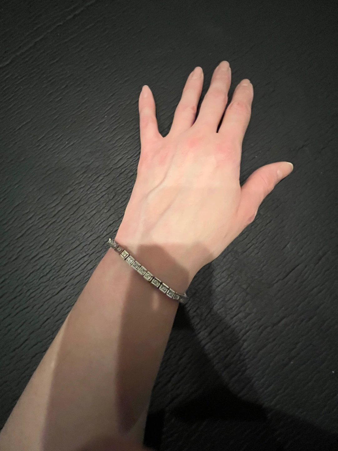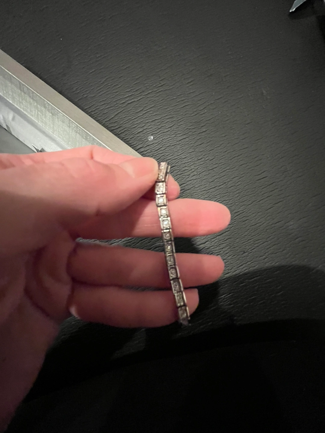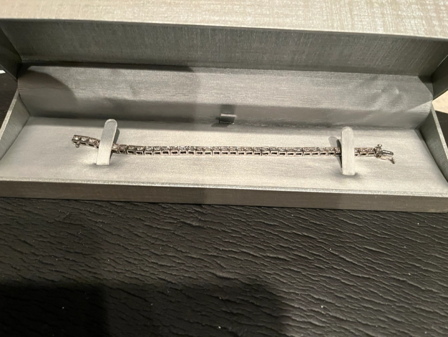 Stunning bracelet. Features a row of sparkling diamonds. Silver tone metal. Comes in original box.