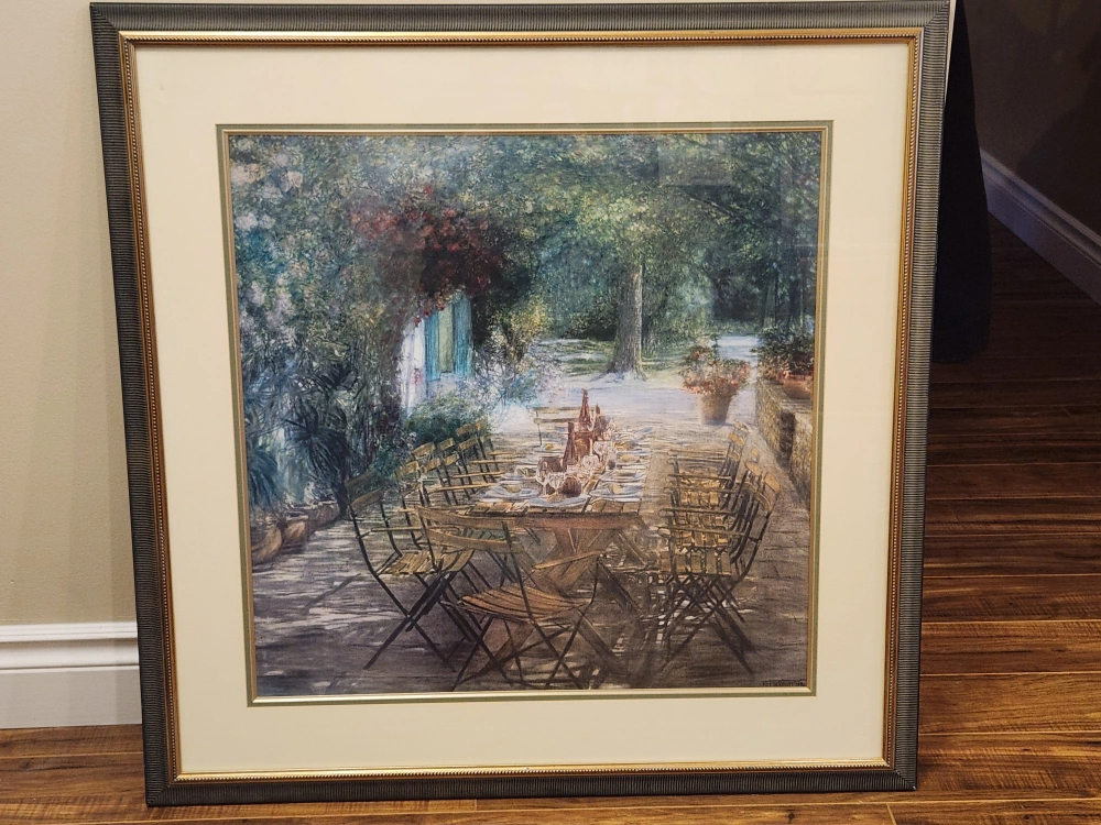 Lovely framed watercolour-style print. Depicts a garden party scene. Set in a gold-toned frame. Beautiful addition to any home.