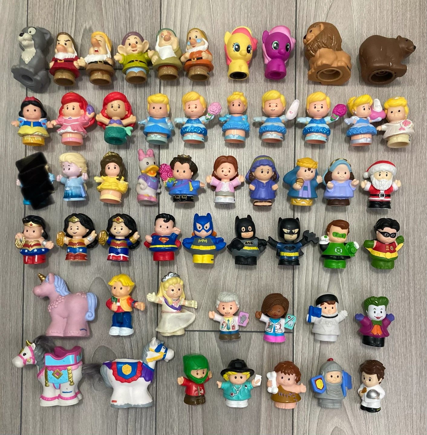 Assortment of figures and animals: different jobs (doctor, dentist, chef, astronaut) Christmas, caveman, cartoon characters (Disney Princess, Mickey Clubhouse, DC, Marvels), ponies/unicorns, bendable characters, animal zoo talkers (lion & bear) etc