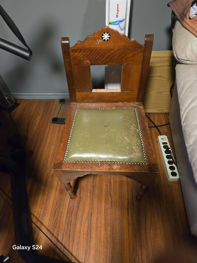 Unique vintage chair. Solid wood frame. Green leatherette seat. Intricate detailing. Small star inlay on the back.