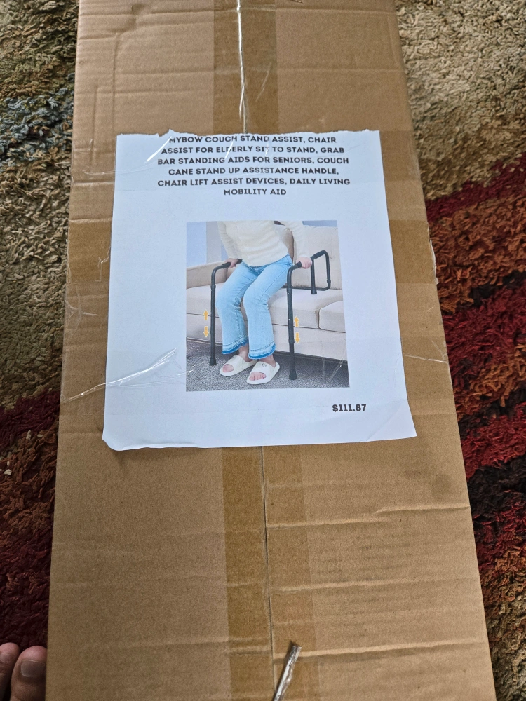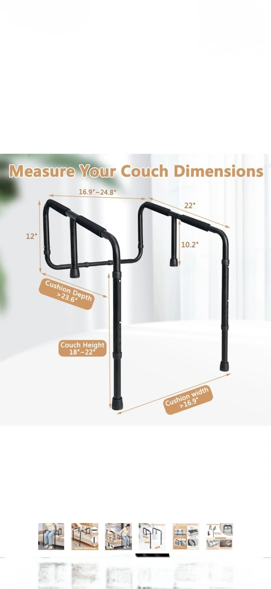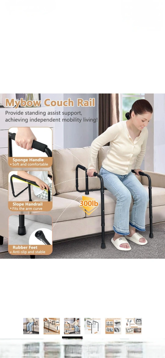 Couch stand assist. Helps with getting up from chairs and couches. Features a sponge handle, slope handrail, and rubber feet. Supports up to 300lb. Easy to install.