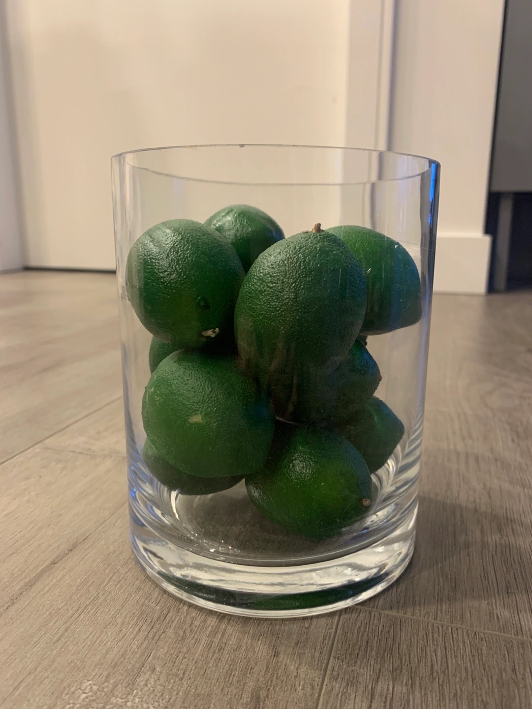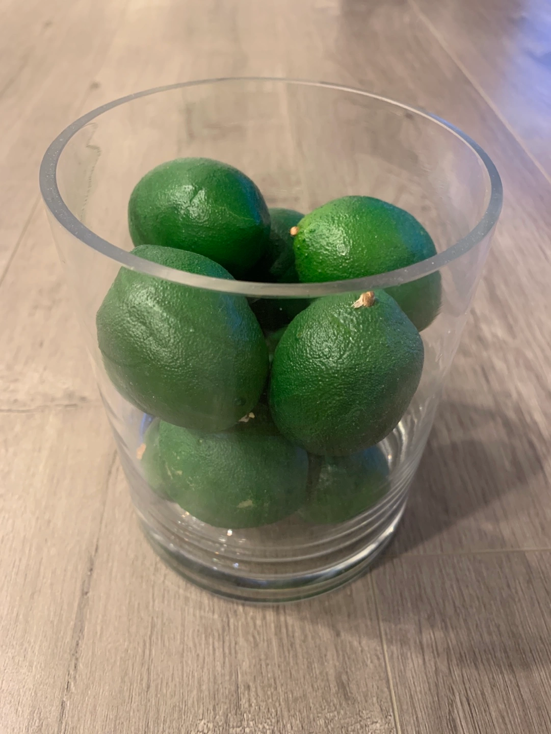 Realistic artificial limes 12 count in a clear glass vase. Perfect for home décor. Includes twelve limes and a cylindrical glass container.